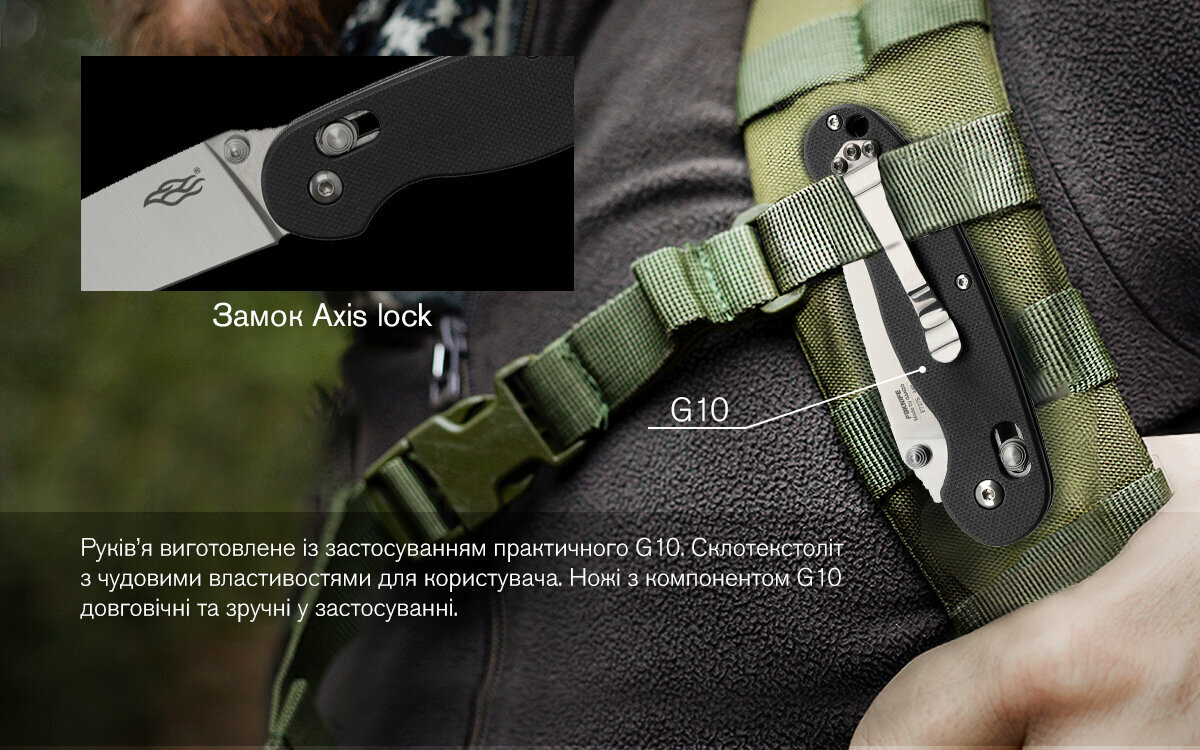 Замовляв цей ніж вже маючи у власності модель F759M, тому вибір цього бренду був усвідомленим. По традиції якість обслуговування на висоті, а якщо підтвердження оплати замовлення відбулося до 12:00 години дня то відправлення з Нової Пошти здійснюється в цей самий день. Доставка швидка і безкоштовна. Ніж компактний, легкий і зручний для повсякденного користування. Лезо ножа гостре із гарним та впевненим різом. Товщина леза по обуху 2.7 мм із заявлених 2.8 мм. Посадка леза реалізована за допомогою підшипників. З коробки осьовий гвинт здається трохи перетягнутим, але крапля мастила допомогла запрацювати механізму так як треба. Форма руків'я ножа ергономічна і дозволяє тримати ніж впевнено в руці. Лайнери полегшеної конструкції. Накладки виготовлені з матеріалу G10 і мають досить шершаву фактуру з коробки, але вони швидко притерлись. Накладки чорного кольору пасують якнайкраще - з ними ніж справді виглядає "дорого" і впевнено підходить до категорії "Джентельменських". На мою думку, родзинкою ножа є міцний замок Axis Lock, який дозволяє відкривати та закривати ніж однією рукою однаково зручно, як правою так і лівою. Для мене пружини замка