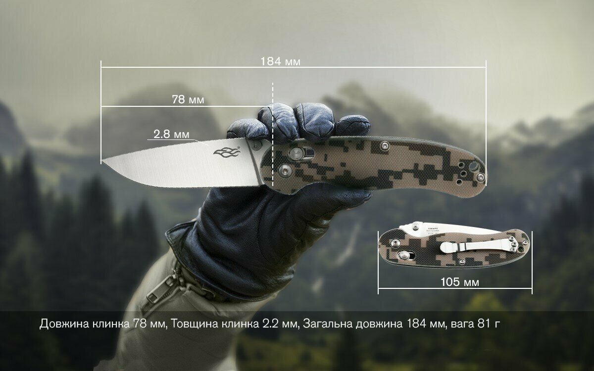 Кольори моделі-Чорний, камуфляж і сірий. Творці подбали про смак цінителів темної гами, злегка розбавивши її оригінальною камуфляжної забарвленням. Ручка виготовлена із застосуванням практичного G10. Склотекстоліт з чудовими користувацькими якостями: міцний, зносостійкий, термостійкий, добре піддається фарбуванню. З таким матеріалом в складі ніж знаходить захищеність від впливів зовнішнього середовища, стаючи по-справжньому безвідмовним в будь-якій ситуації і умовах. Ножі з компонентом G10 довговічні і зручні в застосуванні. Злегка шорстка поверхня ручки забезпечує більш комфортне захоплення-ніж надійно лягає в долоню, не ковзає і не зміщується.