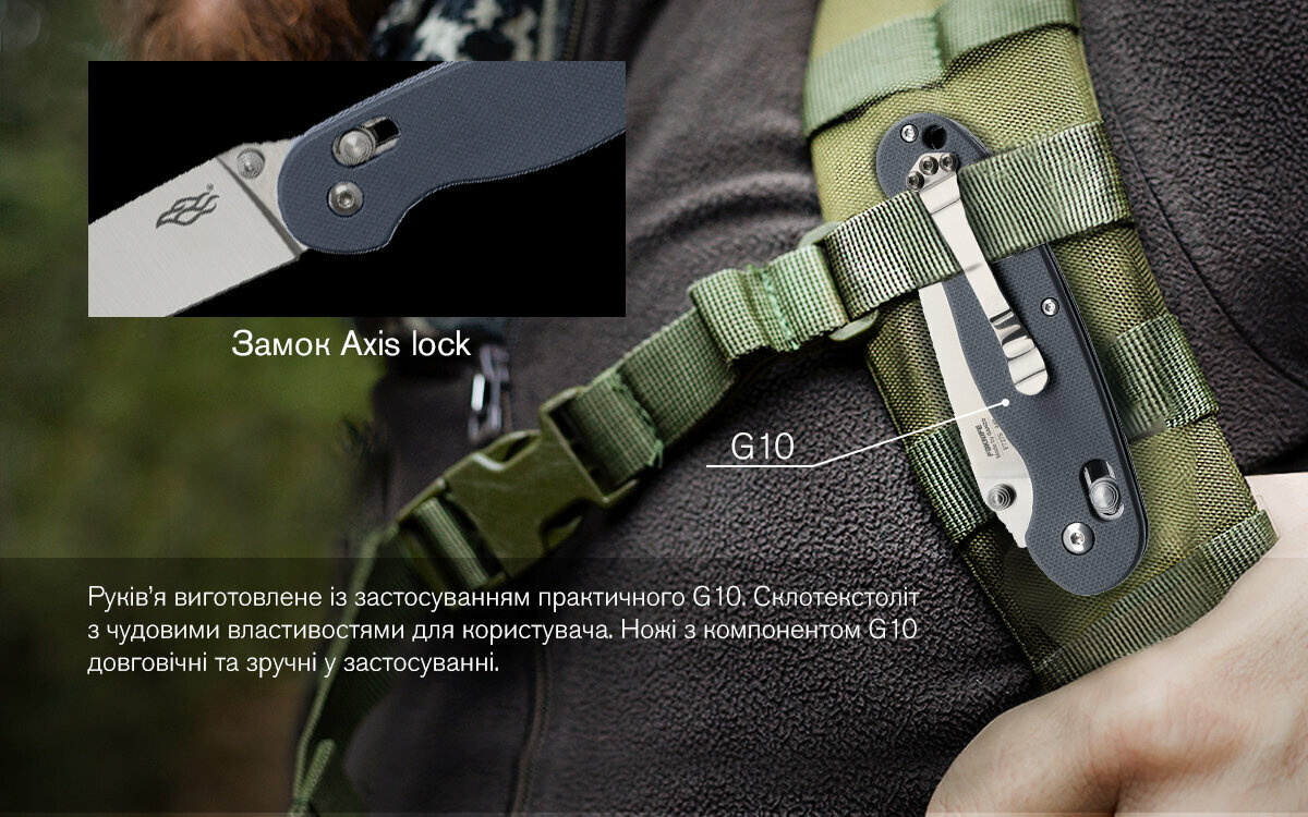 Кольори моделі-Чорний, камуфляж і сірий. Творці подбали про смак цінителів темної гами, злегка розбавивши її оригінальною камуфляжної забарвленням. Ручка виготовлена із застосуванням практичного G10. Склотекстоліт з чудовими користувацькими якостями: міцний, зносостійкий, термостійкий, добре піддається фарбуванню. З таким матеріалом в складі ніж знаходить захищеність від впливів зовнішнього середовища, стаючи по-справжньому безвідмовним в будь-якій ситуації і умовах. Ножі з компонентом G10 довговічні і зручні в застосуванні. Злегка шорстка поверхня ручки забезпечує більш комфортне захоплення-ніж надійно лягає в долоню, не ковзає і не зміщується.