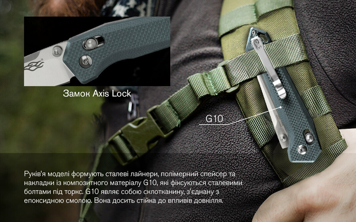 G10 являє собою склотканину, з'єднану з епоксидною смолою. Вона досить стійка до впливів зовнішнього середовища. Витримує удари, вологонепроникна, при цьому без проблем піддається обробці і фарбуванню. Подібні риси матеріалу роблять його прекрасним вибором для використання при виробництві практичних і надійних ножів. Таким чином, ми отримуємо модель, готову до непростих випробувань, гідну довіри, і абсолютно безпечну. Ергономічна ручка новинки зручно тримається в долоні користувача, і не вислизає з руки, навіть якщо вона мокра.