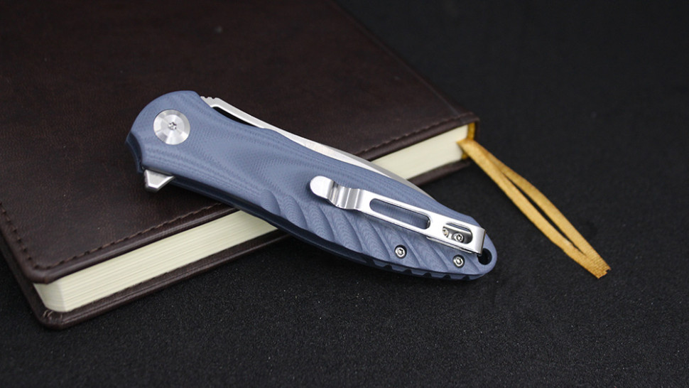 Ручка примірника зроблена з традиційного G10, що надає їй зносостійкість, захист від впливу високої температури, вологи, і стійкість до пошкоджень. Також цей матеріал, який являє собою склотекстоліт, без особливих зусиль забарвлюється. Він шорсткий на дотик. Ніж зручно тримати в долоні, він не зміщується, не ковзає. Виріб відноситься до розряду так званих фліпперів.