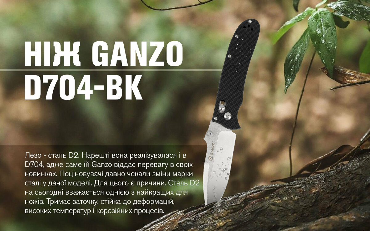 Лезо - сталь D2. Нарешті вона реалізувалася і в G704, адже саме її Ganzo віддає перевагу в своїх новинках. Цінителі давно чекали зміни марки сталі у даній моделі. На це є причини. Сталь D2 на сьогодні вважається однією з кращих для ножів. Тримає заточку, стійка до деформацій, високих температур і корозійних процесів.