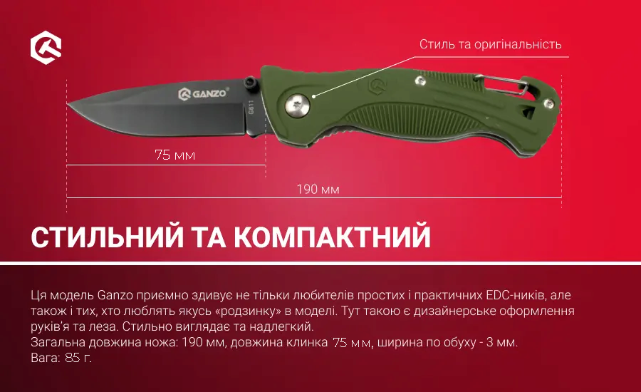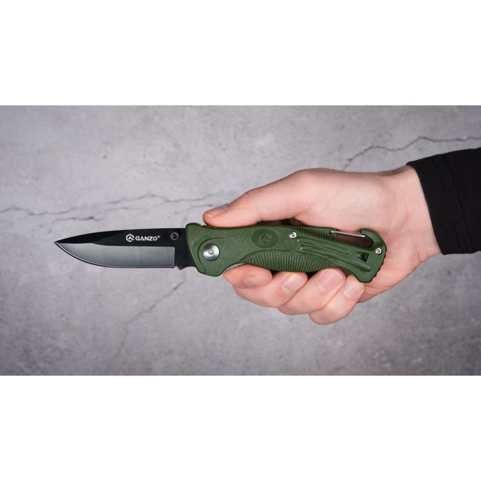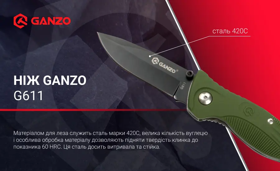 Опис ножа Ganzo G611 green: Відмінна покупка-ніж G611 green. Матеріалом для леза служить сталь марки 420С. Велика кількість вуглецю і особлива обробка матеріалу дозволяють підняти твердість клинка до показника 60 HRC. При всьому цьому він довго залишається гострим.