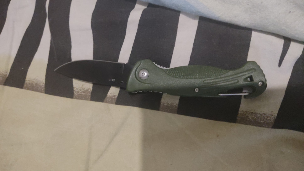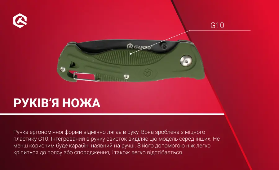 Ручка ергономічної форми відмінно лягає в руку. Вона зроблена з міцного пластику чорного кольору. Інтегрований в ручку свисток виділяє цю модель серед інших. Цей додатковий аксесуар може стати незамінним в екстремальних ситуаціях. Не менш корисним буде карабін, наявний на ручці. З його допомогою ніж легко кріпиться до поясу або спорядження, і також легко відстібається. Модель G611 green буде дуже корисна для туристів і рибалок.