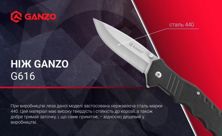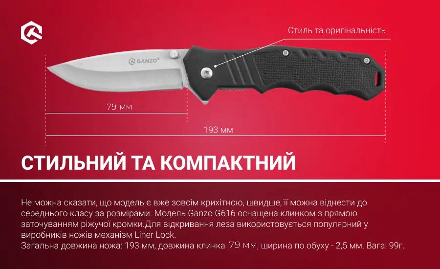 Не можна сказати, що модель є вже зовсім крихітною, швидше, її можна віднести до середнього класу за розмірами, адже довжина ножа в робочому стані – 193 мм, а в кишеньковому варіанті – 114 мм. Модель Ganzo G616 оснащена клинком з прямою заточуванням ріжучої кромки, його довжина – 79 мм, а товщина – 2,5 мм. Для відкривання леза використовується популярний у виробників ножів механізм Liner Lock.