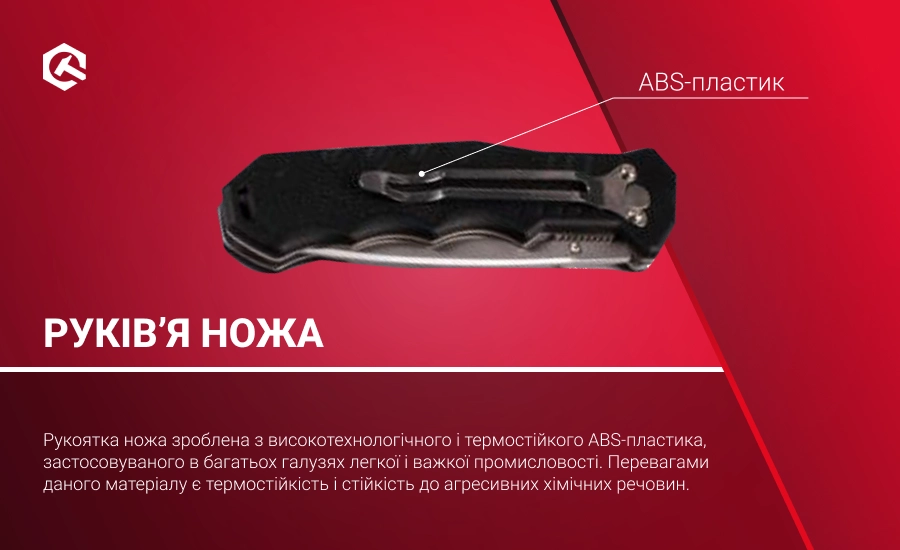 Рукоятка ножа зроблена з високотехнологічного і термостійкого ABS-пластика, застосовуваного в багатьох галузях легкої і важкої промисловості. Перевагами даного матеріалу є термостійкість і стійкість до агресивних хімічних речовин.