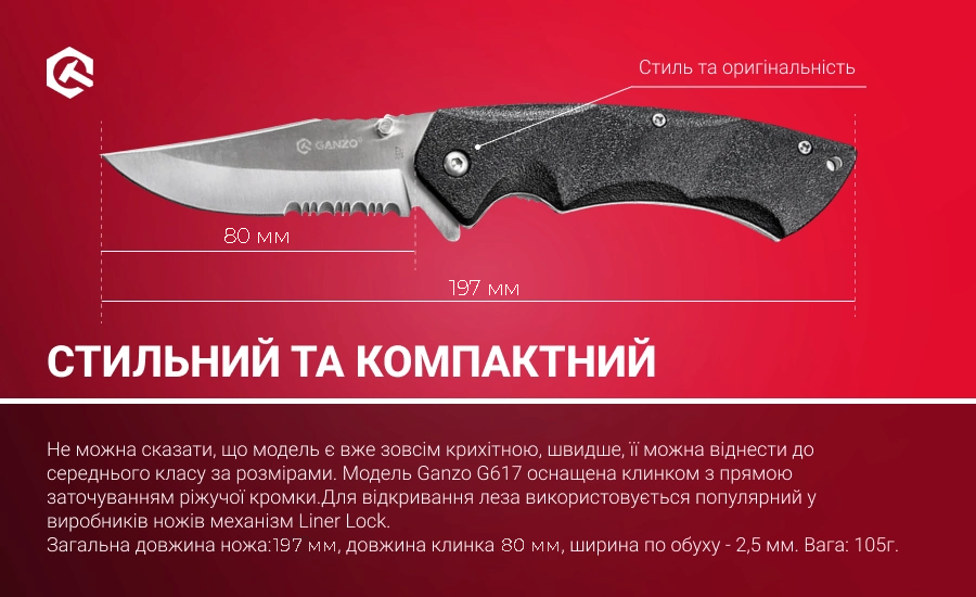 Модель відноситься до середніх за розміром, довжина ножа з відкритим лезом – 197 мм, а в складеному вигляді – 117 мм. Модель Ganzo G617 має клинок полусеррейторного типу, тобто частина клинка —це лезо з гладкою заточкою, а частина - так зване серрейторное лезо, в якому є пилкоподібні щербини по ріжучій кромці.