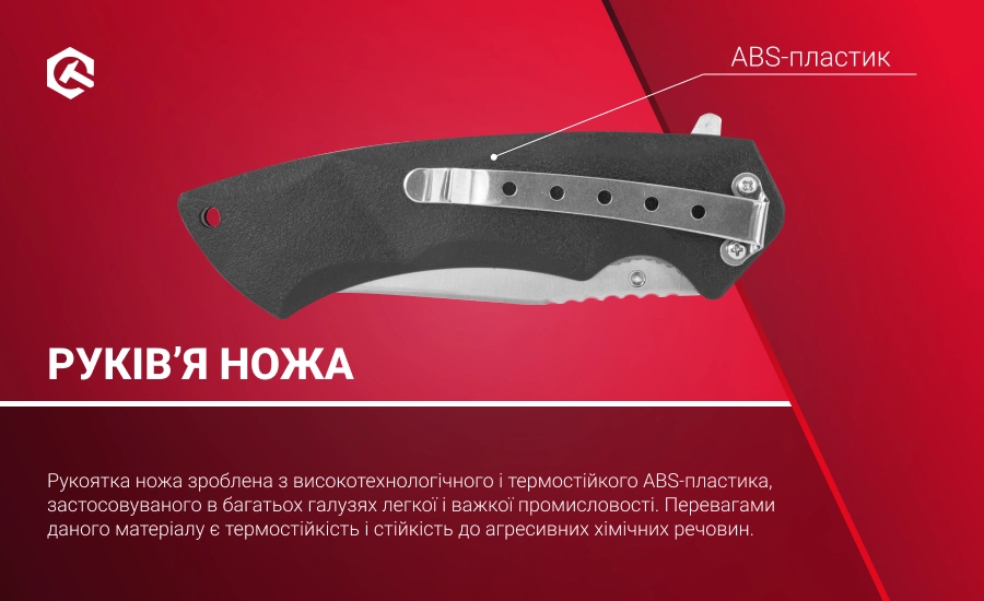 При виготовленні рукоятки ножа застосований ABS-пластик, який цінується за термостійкість і стійкість до агресивних хімічних речовин. Рукоятка ножа, як не можна ДО РЕЧІ, вписується в дизайн даної моделі, що робить виріб ще більш привабливим. На рукоятці є зручне кріплення-кліпса, що дозволяє закріпити ніж на ремені, в кишені або на екіпіровці. Текстурування, нанесене на рукоять, забезпечує її зручне і надійне розташування в руці, навіть при екстремальних умовах експлуатації.