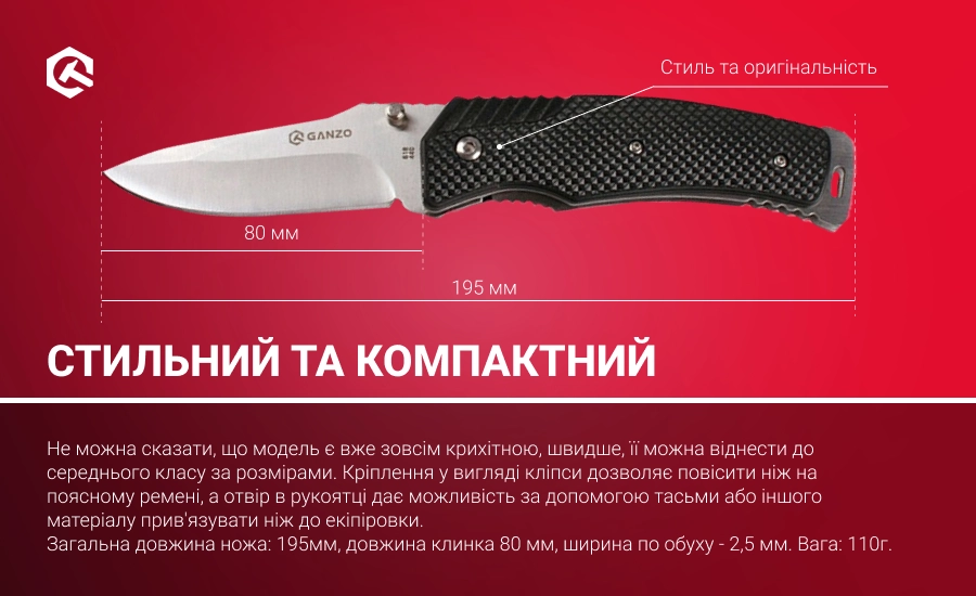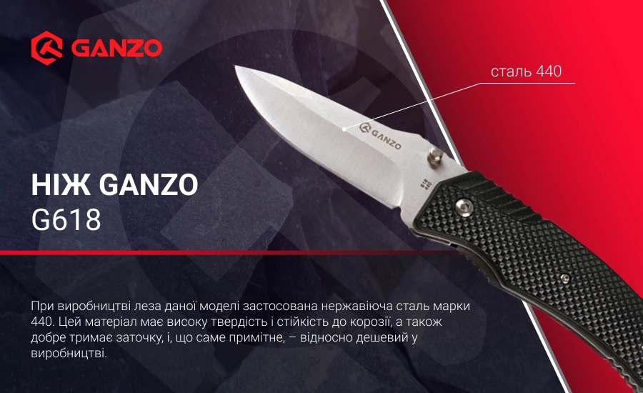 Модель являє собою класичний і надійний в експлуатації ніж середнього розміру. Довжина ножа в робочому стані становить 195 мм, а в складеному вигляді – 115 мм. Модель Ganzo G618 має лезо прямого заточування довжиною 80 мм і товщиною 25 мм.