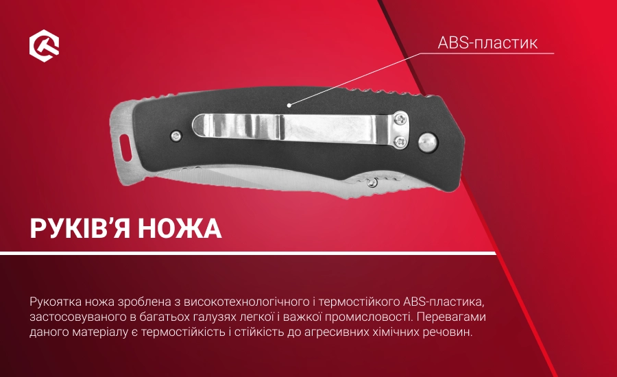Рукоятка ножа виготовлена з ABS-пластика-лідера на багатьох світових виробництвах легкої і важкої промисловості, що володіє підвищеною термостійкістю і стійкістю до агресивних хімічних речовин. Рукоятка ножа відмінно вписується в дизайн виробу, а ненав'язлива накатка на її поверхні підвищує тертя між ножем і рукою тримає, що робить хват міцним і в той же час зручним.