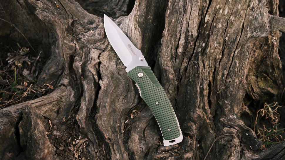 Клинок виготовлений з хромистої сталі 440, відомої своєю міцністю та корозійною стійкістю. Лезо досить швидко заточується та демонструє акуратне різання, а ребристий упор для пальця дозволяє краще контролювати клинок під час силових робіт.