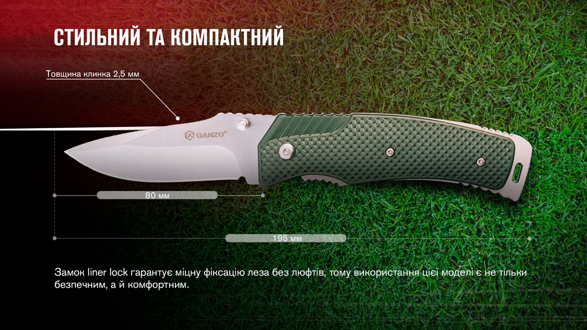 Складаний клинок з прямим заточуванням перетворює ніж Ganzo G618 в універсальний інструмент для повсякденного носіння. Гостре лезо сягає 80 мм у довжину та ріже не лише папір, картон і мотузки, а й щільніші матеріали, що особливо актуально у польових умовах.