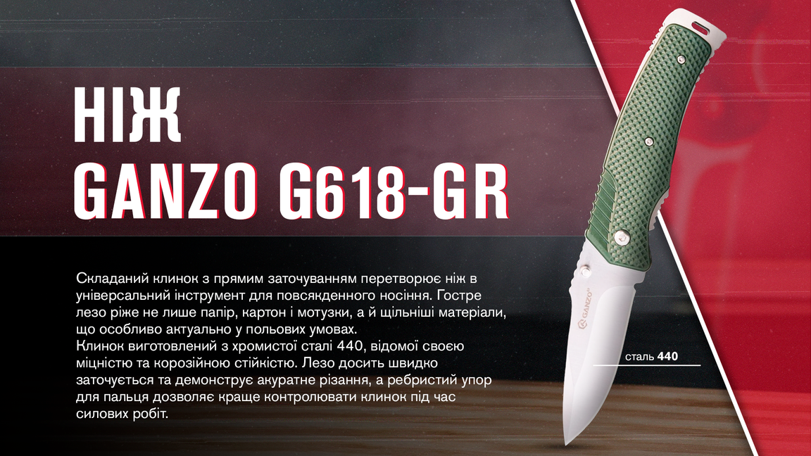 Складаний клинок з прямим заточуванням виготовлений з хромистої сталі 440, відомої своєю міцністю та корозійною стійкістю. Товщина клинка становить 2.5 мм, а його довжина сягає 80 мм. Замок liner lock гарантує міцну фіксацію леза, а нековзні плашки з ABS-пластику на руківʼї відповідають за ергономіку конструкції. Ніж Ganzo G618 важить 110 г та оснащений кишеньковим затискачем.
