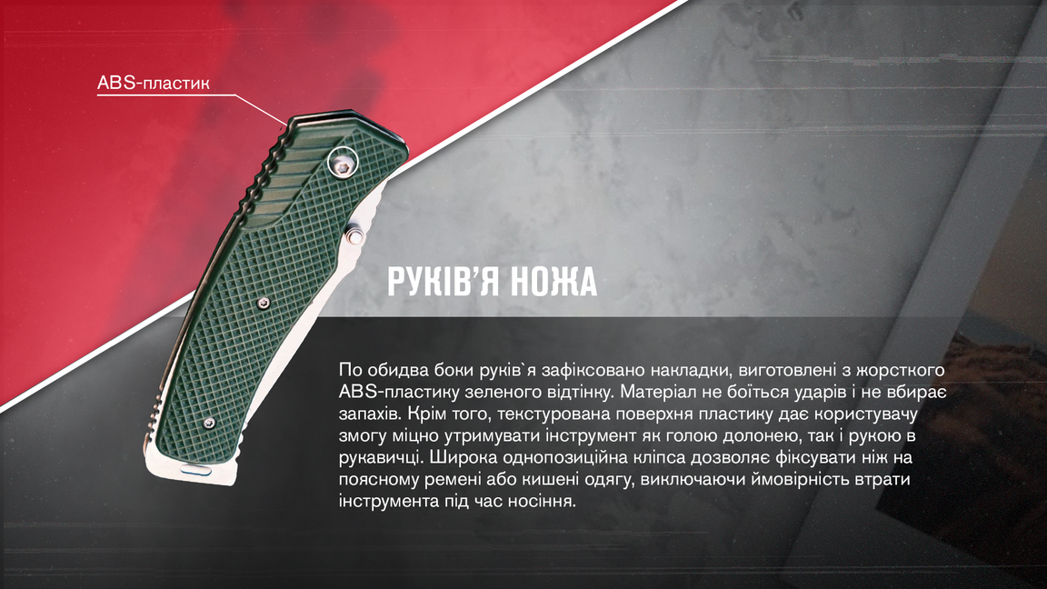 По обидва боки руківʼя зафіксовано накладки, виготовлені з жорсткого ABS-пластику зеленого відтінку. Матеріал не боїться ударів і не вбирає запахів. Крім того, текстурована поверхня пластику дає користувачу змогу міцно утримувати інструмент як голою долонею, так і рукою в рукавичці.