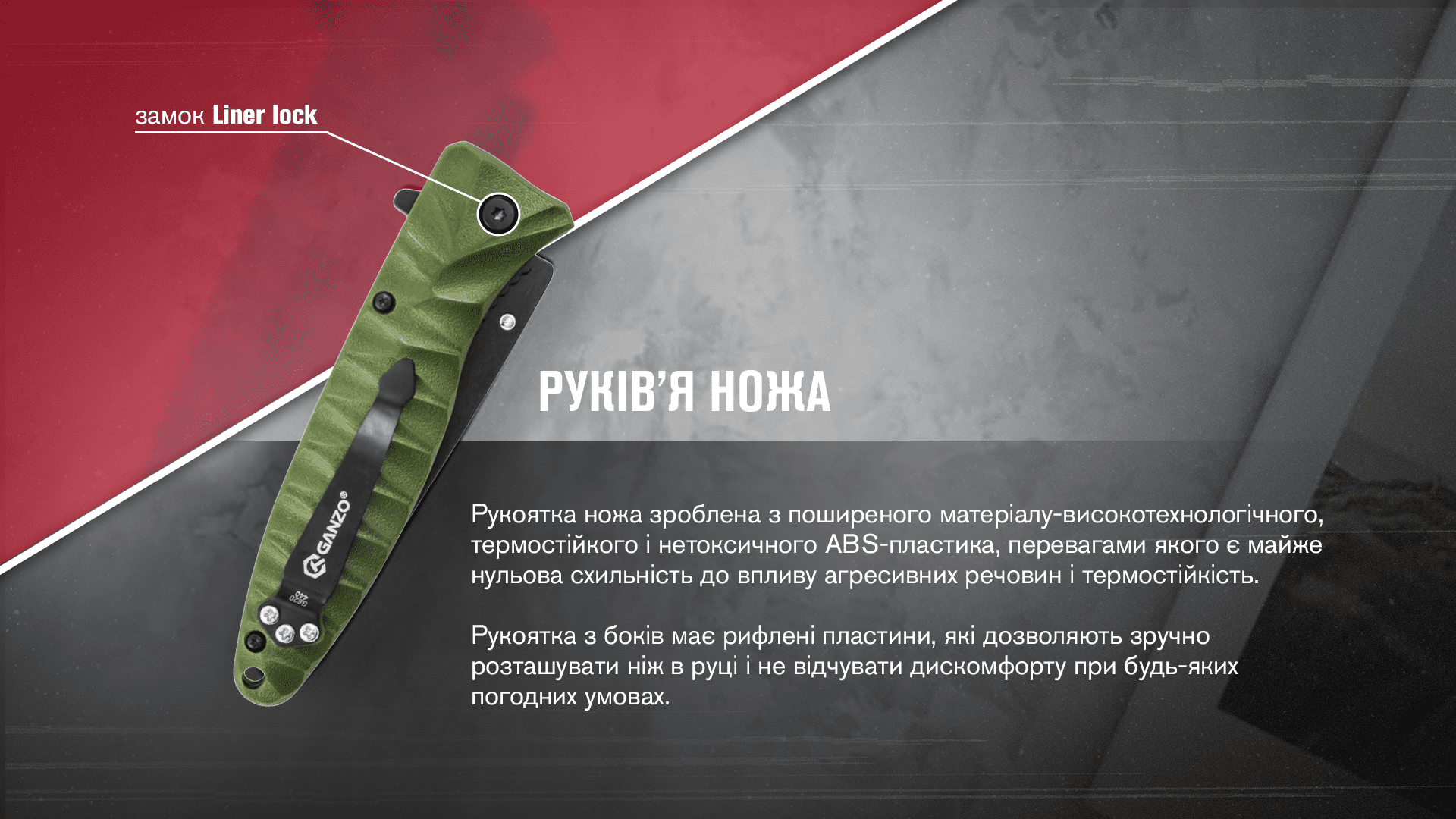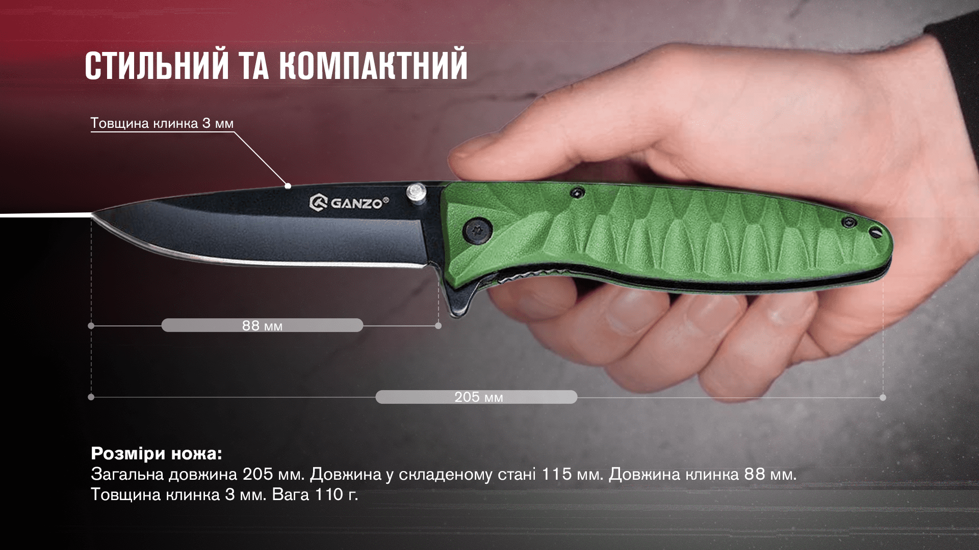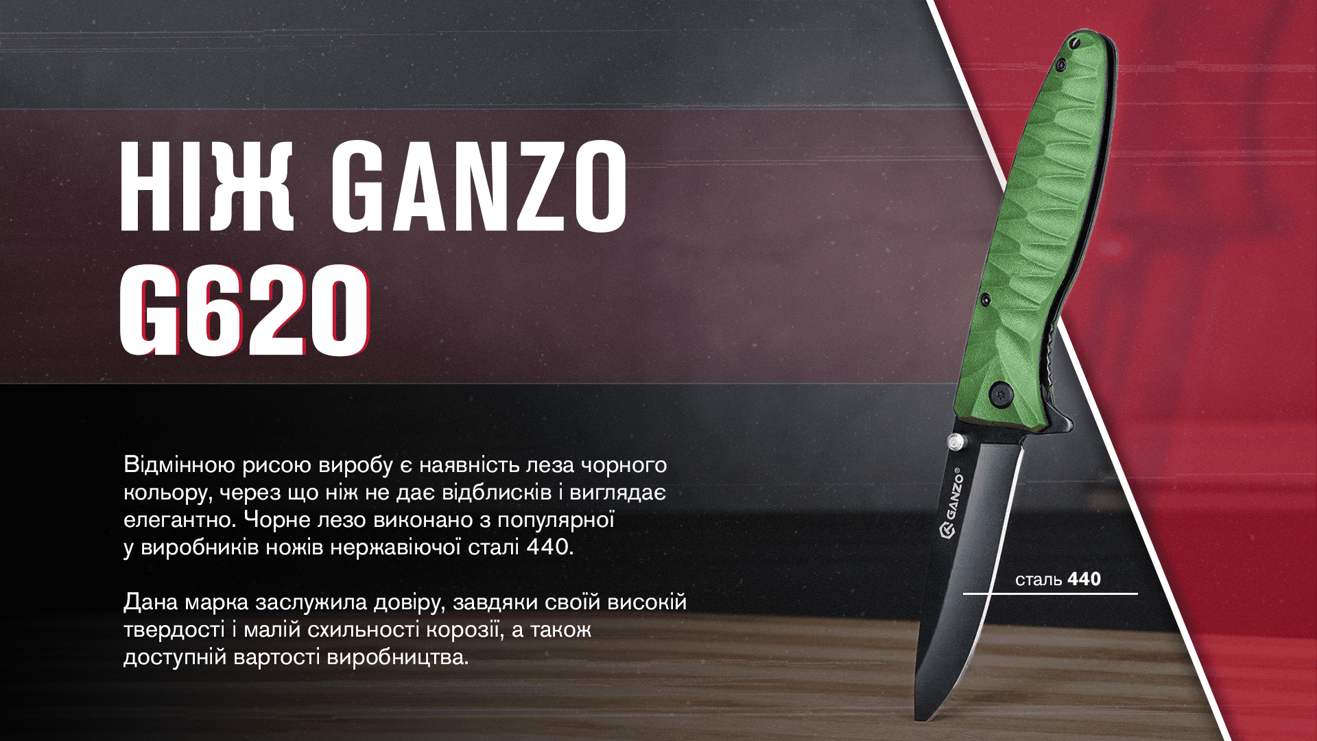 У моделі Ganzo G620B-1 клинок з прямою заточуванням ріжучої кромки. Його довжина становить 88 мм, а товщина обуха - 3 мм.Для фіксації леза застосований механізм з багаторічною історією – LinerLock, головною перевагою якого є безпека і зручність експлуатації.
