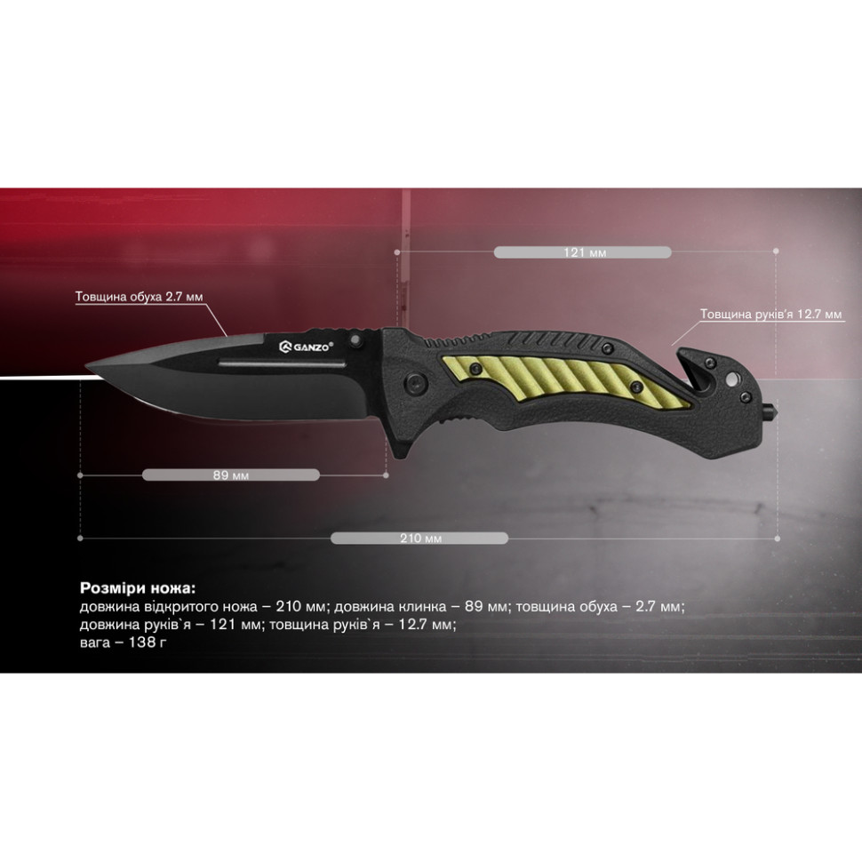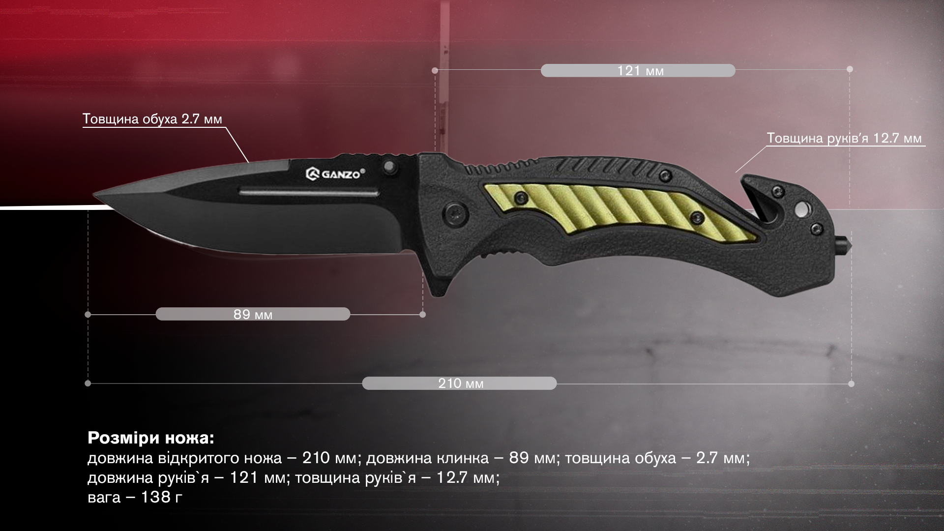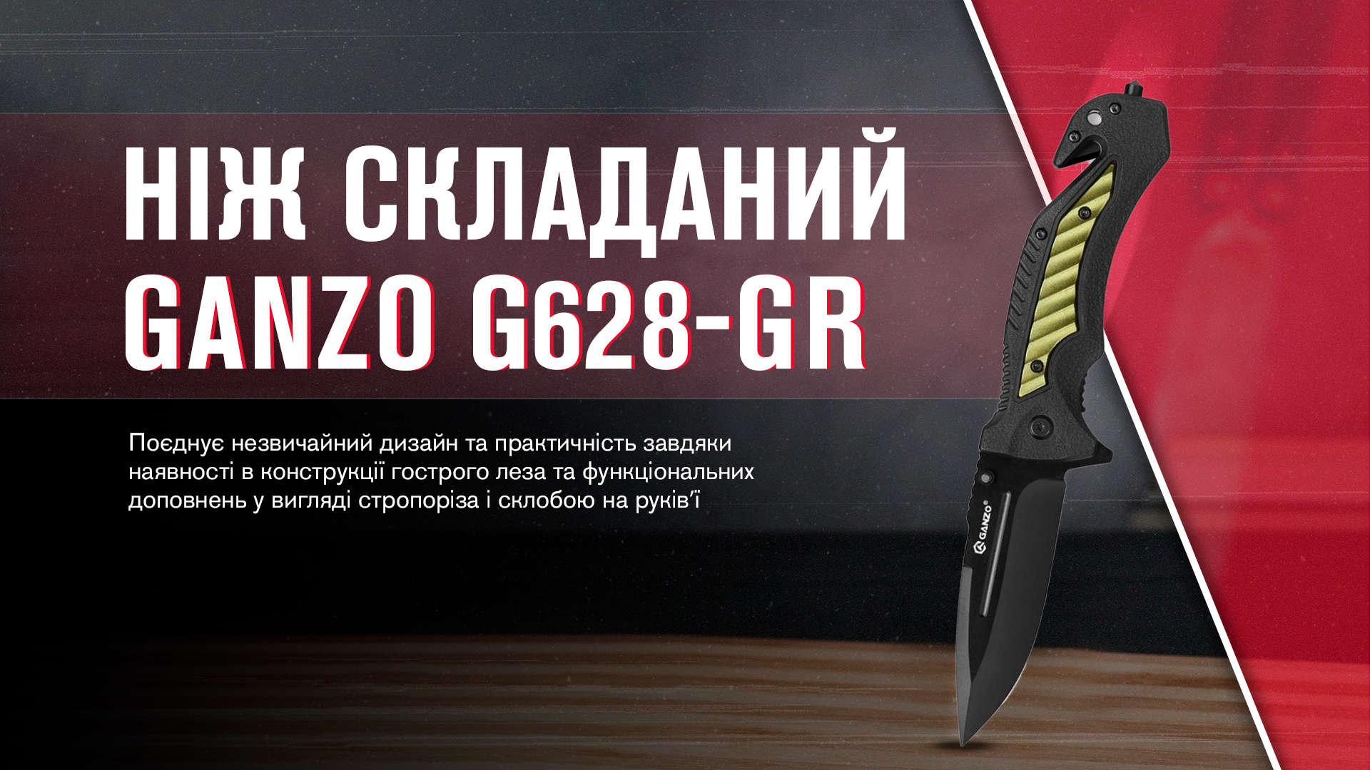 Складаний ніж Ganzo G628 підходить для туристичних цілей завдяки міцній та функціональній конструкції, яка включає не тільки клинок drop point, а й доповнення у вигляді стропоріза та склобою на руківʼї. Клинок виготовлений зі сталі 8cr14 і сягає 89 мм у довжину. На обуху є рельєфний упор для пальця, що в сукупності з вигнутою формою руківʼя покращує утримання. Матеріал руківʼя — поліпропілен з алюмінієвими елементами.