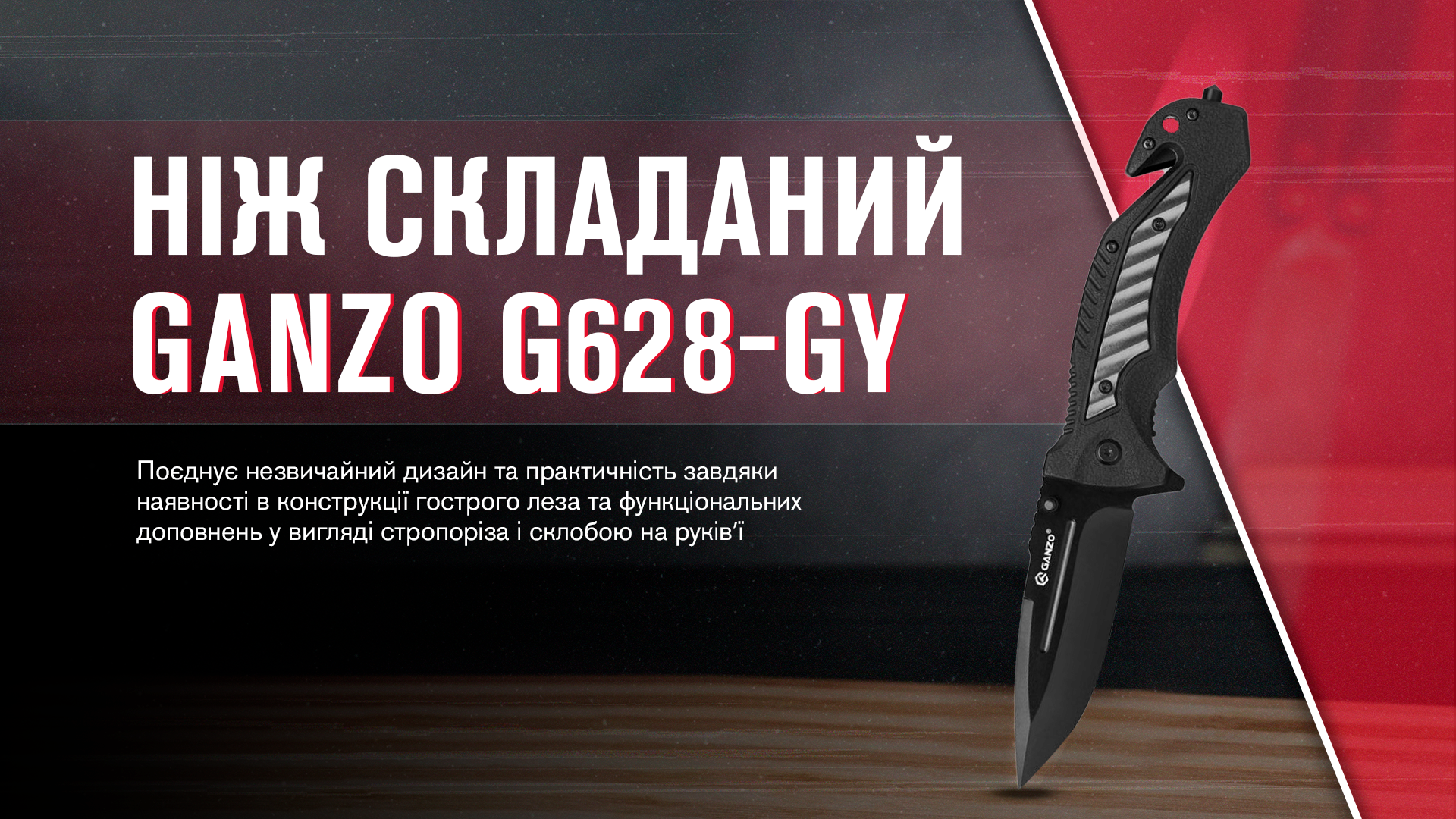 Складаний ніж Ganzo G628 підходить для туристичних цілей завдяки міцній та функціональній конструкції, яка включає не тільки клинок drop point, а й доповнення у вигляді стропоріза та склобою на руківʼї. Клинок виготовлений зі сталі 8cr14 і сягає 89 мм у довжину. На обуху є рельєфний упор для пальця, що в сукупності з вигнутою формою руківʼя покращує утримання. Матеріал руківʼя — поліпропілен з алюмінієвими елементами.