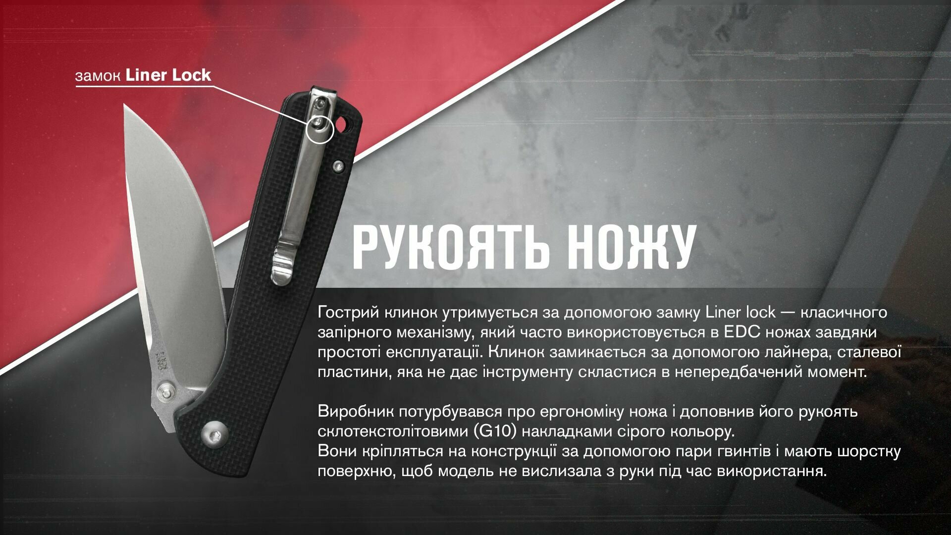 Виробник потурбувався про ергономіку ножа і доповнив його рукоять склотекстолітовими (G10) накладками сірого кольору. Вони кріпляться на конструкції за допомогою пари гвинтів і мають шорстку поверхню, щоб модель не вислизала з руки під час використання. Довжина рукояті становить 112 міліметрів і підходить власникам долоні будь-якого розміру.