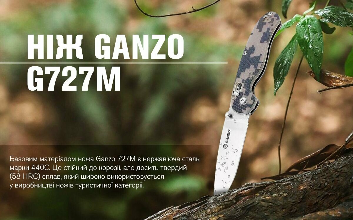 Базовим матеріалом ножа Ganzo 727m є нержавіюча сталь марки 440С. це стійкий до корозії, але при цьому досить твердий (58 HRC) сплав, який широко використовується у виробництві ножів туристичної категорії. Довжина леза досягає 8,9 см, а його товщина з боку обуха — 3,5 мм.Ніж заточений повністю гладко, що дозволяє робити рівні і акуратні розрізи.