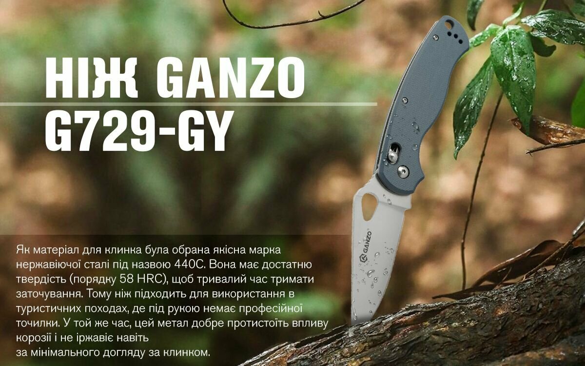 Стильний і функціональний ніж Ganzo G729-GY має схожий дизайн з моделлю Spyderco і є уособленням надійного клинка для повсякденного використання, який не боїться складної роботи. В основі моделі перевірені матеріали, включаючи хромистую сталь 440C і високоміцні накладки G10, які роблять ніж універсальним інструментом.