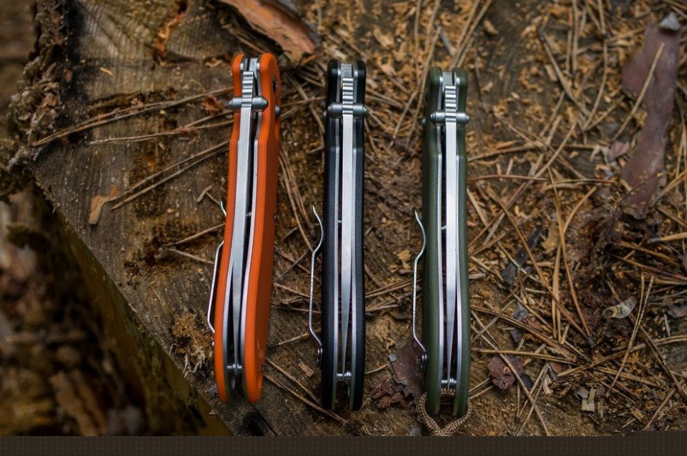 Рукоять ножа отримала дві накладки з надійного склопластику G10. Запасу його міцності повністю достатньо для ножа, який буде використовуватися в мисливських і туристичних цілях. На ручці закріплена сталева кліпса, яка допомагає закріпити ніж на ремені, щоб він не загубився. Додатково передбачена можливість приєднання темляка для страховки на зап'ясті або ж на лямці рюкзака. Колір рукояті в даній моделі може бути чорним, помаранчевим або ж зеленим. Також на рукоятці видно частину замку для фіксації леза. Це механізм конструкції Axis з металевим штифтом. Для відкривання ножа, на лезі розташований невеликий шпенек.