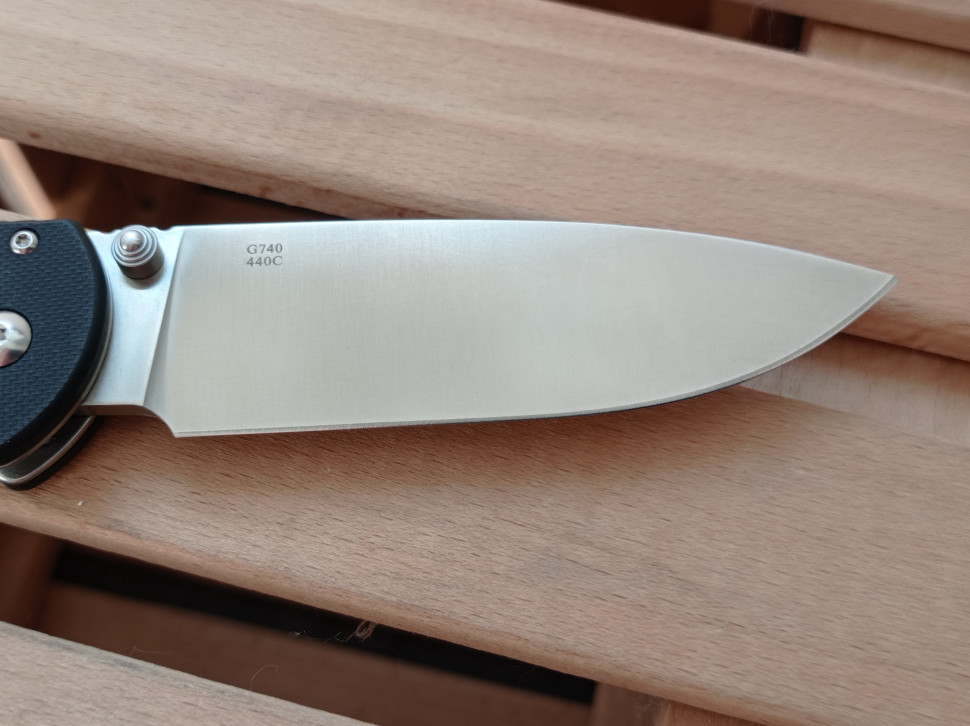 Ніж Ganzo G740 відрізняється від інших моделей досить значними розмірами. Але завдяки складаний конструкції, його все так само легко взяти з собою на поїздку на природу і використовувати як для стандартних робіт, так і для найбільш складних. Лезо ножа виконано з високоякісної твердої і нержавіючої сталі 440С.цей сплав відмінно збалансований щодо корозійної стійкості і твердості металу. Тому ніж не потребує особливо складного догляду: не іржавіє на риболовлі або в туристичному поході, довго залишається гострим навіть при постійному використанні. Довжина леза в даній моделі становить 9,5 см. воно рівно і гладко заточене по всій довжині. Товщина клинка теж трохи більше, ніж зазвичай пропонує компанія Ganzo і становить 3.5 мм.цим потужним клинком можна з легкістю обробити м'ясо, перерізати невеликі гілки, заготовити стружки для розпалювання багаття. При цьому, модель Ganzo G740 повністю відповідає нормам, які дозволяють говорити, що цей ніж не є зброєю і дозволений до використання широким колом людей.