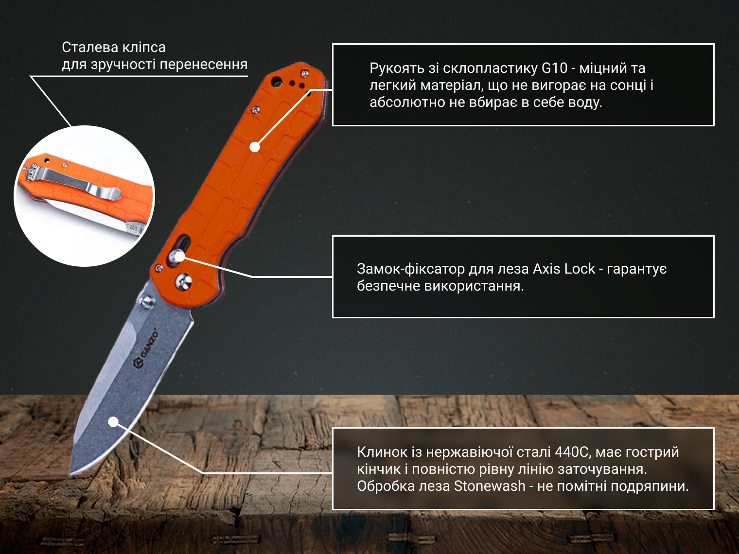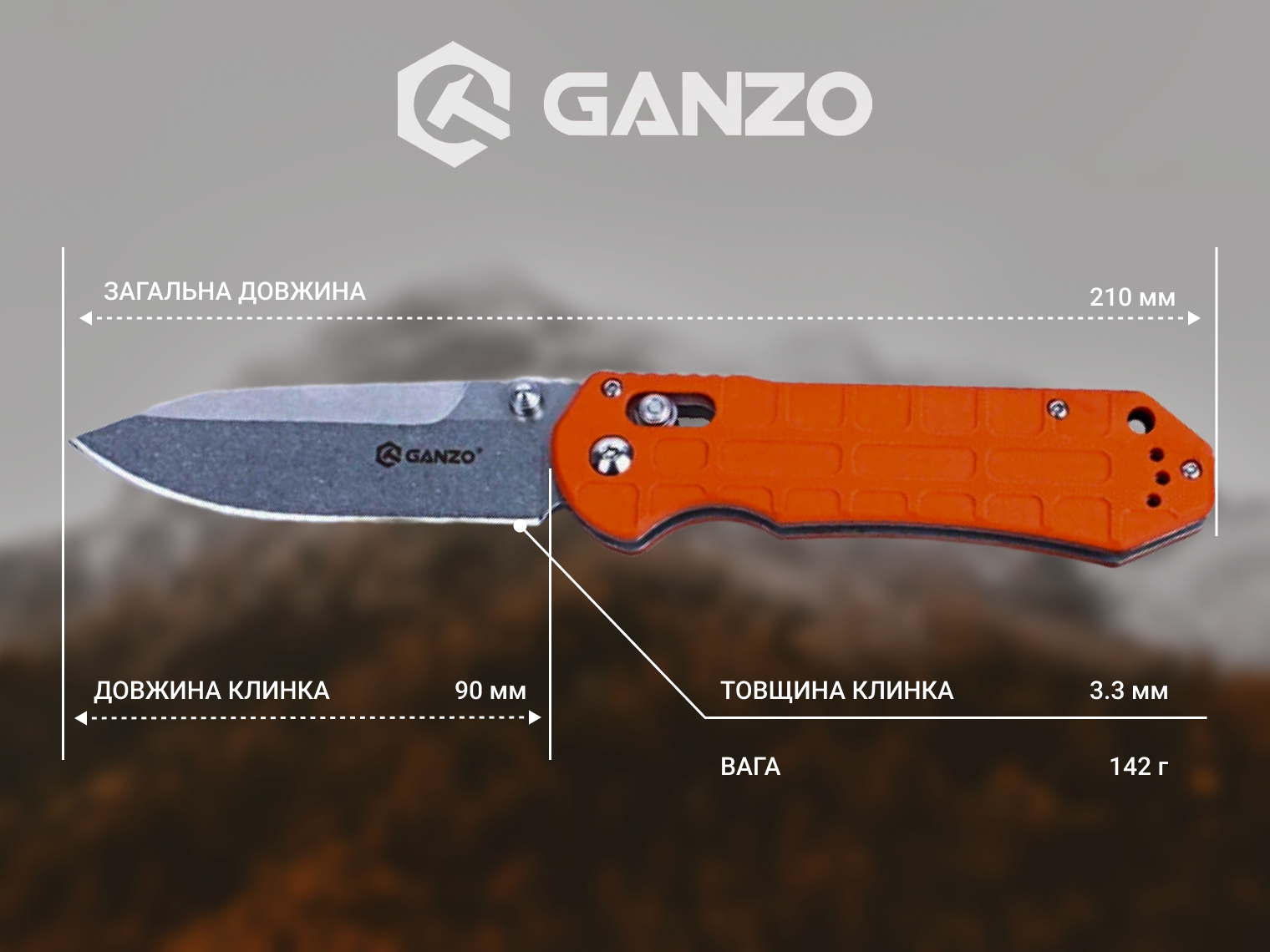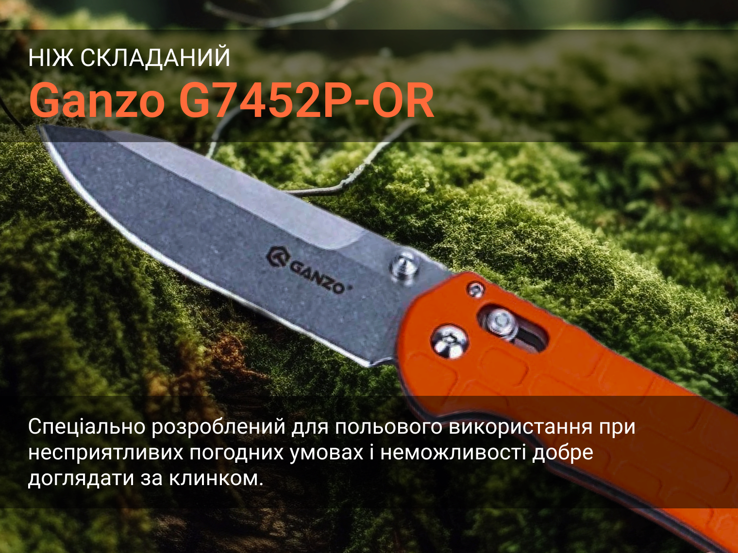 Модель Ganzo G7452Р розроблена для туризму і поїздок на природу. Крім того, що цей ніж легко складається і поміщається в кишеню, він зроблений з нержавіючого металу. Розмір клинка у Ganzo G7452Р становить 9 см, він рівно заточений по всій довжині кромки.