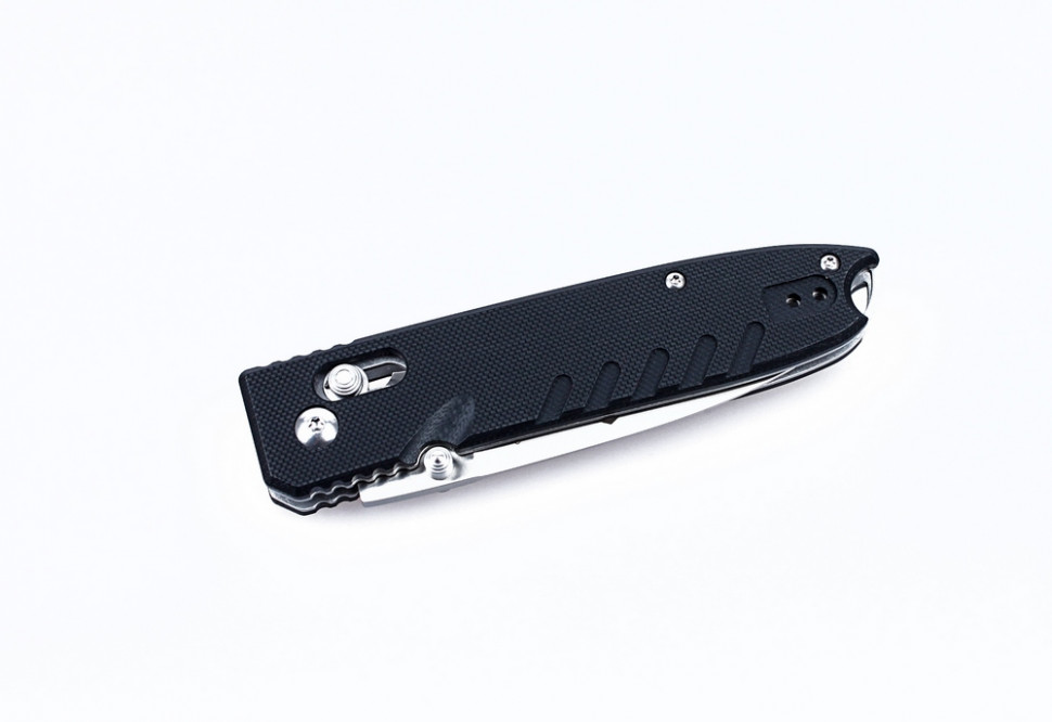 В основі рукоятки ножа G746 - 1 також лежить сталь. Але метал з обох сторін прикритий накладками з композитного різновиду пластику-G10. Це робить ручку ножа більш комфортною: з ергономічними формами і несприйнятливістю до перепадів температур. Що стосується міцності, то G10 майже не поступається сталі. Рукоятка прикрашена дрібною накаткою і до неї прикріплена кліпса для страховки ножа від випадкової втрати.