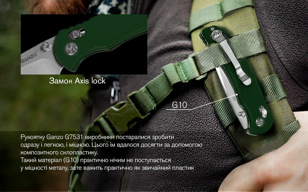 Ніж Ganzo G7531 виготовлений таким чином, щоб задовольнити запити відразу великого числа покупців. Він підходить для всіх видів туризму та інших різновидів активності на природі. Його так само успішно можна використовувати і в місті. Дана модель зроблена складаний, що істотно полегшує її перевезення. Більш того, вбудований в ніж замок, надійно блокує хід леза по осі, щоб воно не могло переміщатися самостійно при використанні ножа. В даному випадку, це замок Axis, що дозволяє легко відкривати ніж в разі потреби однією рукою.