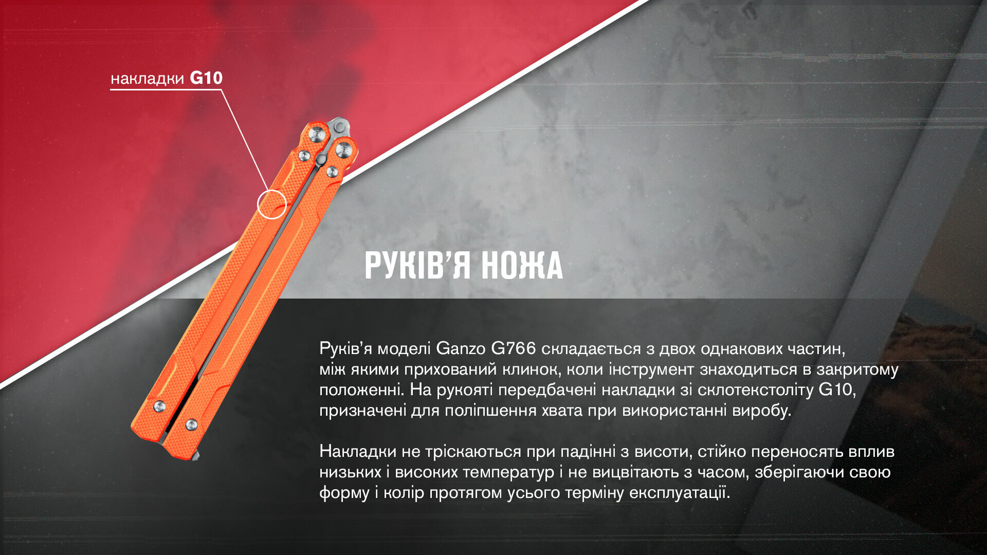 Модель G766-Перший ніж-метелик в асортименті компанії, що відрізняється від більшості аналогічних інструментів інших виробників своєю надлегкою вагою і зручністю у використанні. Балісонг від Ganzo - це переплетення вікових традицій з вироблення ножів-метеликів і особистих винаходів компанії, яка зробила з цього стильного аксесуара надійний і ефективний інструмент для сучасного користувача.