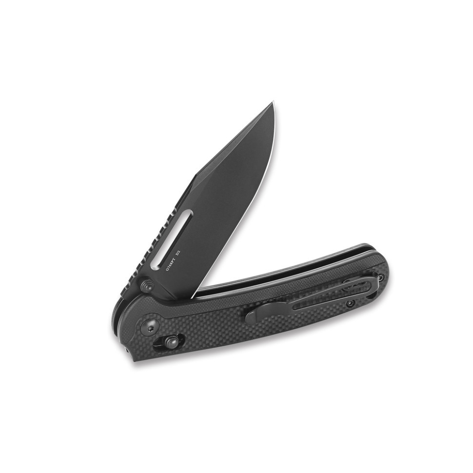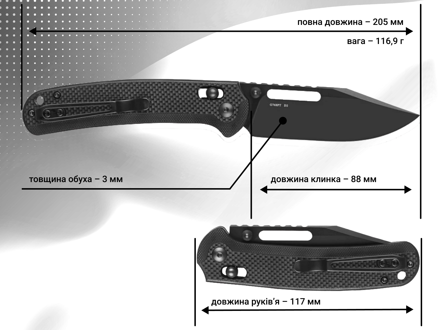 Клинок ножа G768PT виготовлений зі сталі D2 з чорним покриттям, яке зміцнює метал і робить його ще більш корозійностійким. Модель можна відкрити, натиснувши на шпеник або підчепивши пальцем за отвір. Обух завтовшки 3 мм доповнений упором для пальця. Руківʼя оснащене накладками зі склотекстоліту G10 з шорсткою поверхнею. В інструменті передбачено двопозиційну кліпсу. Разом з нею вага ножа дорівнює 116,9 г.