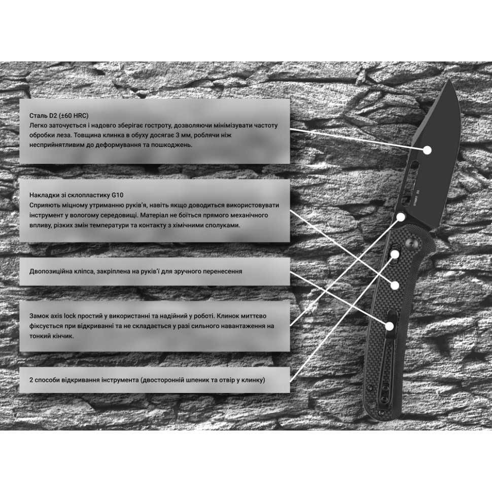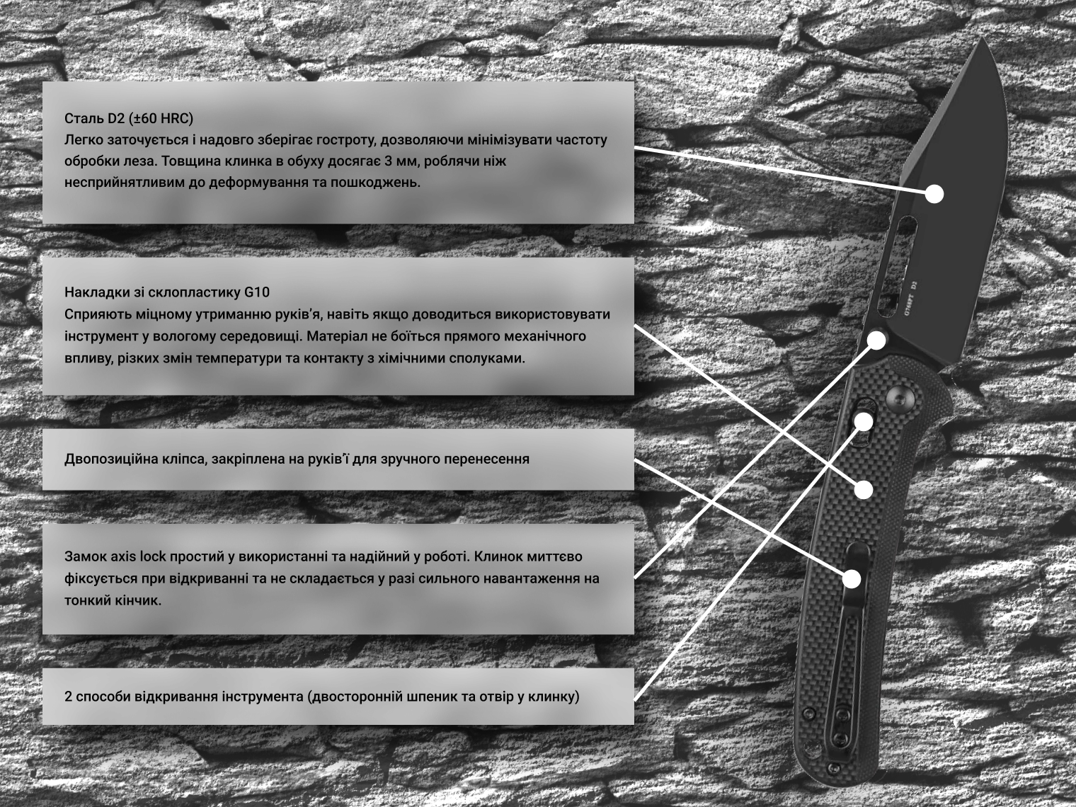 - Сталь D2 в клинку легко заточується та надовго зберігає гостроту, дозволяючи мінімізувати частоту обробки леза. Товщина клинка в обуху сягає 3 мм, роблячи ніж несприйнятливим до деформування та пошкоджень.