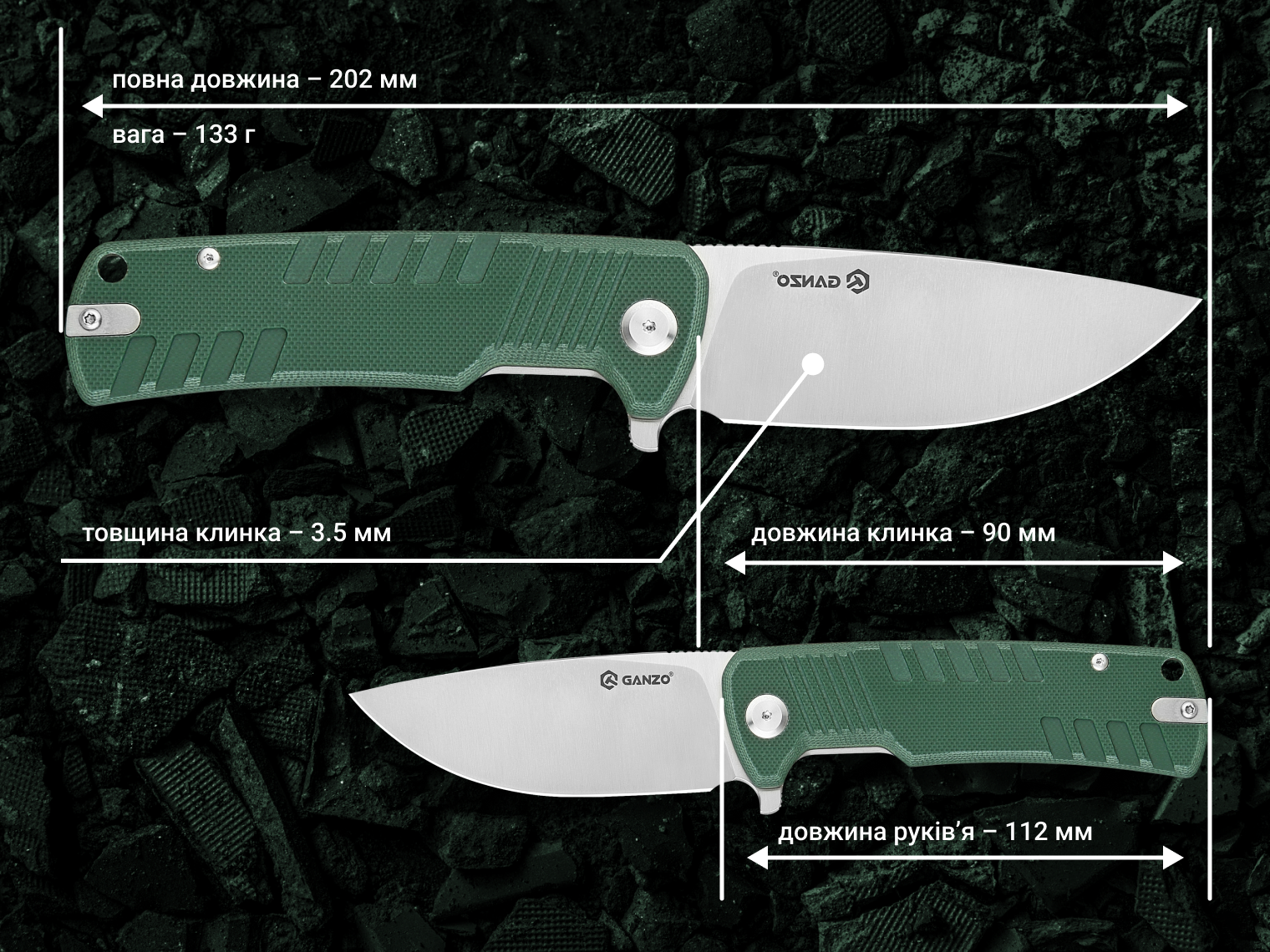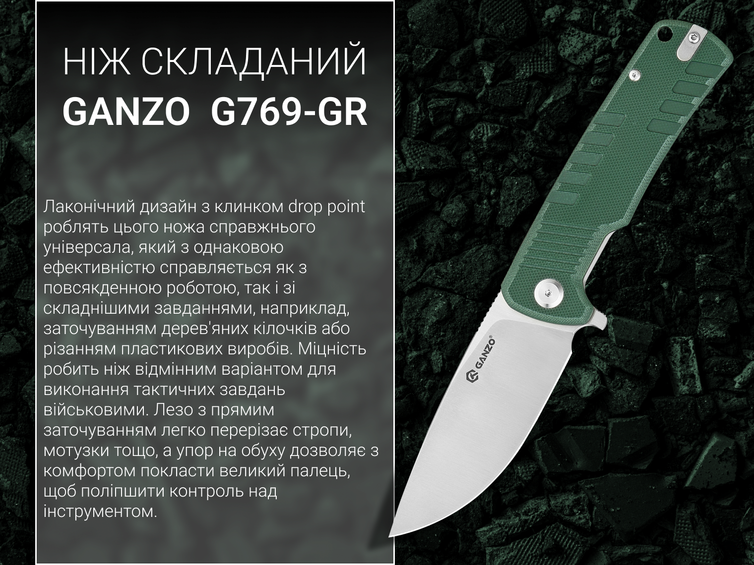 Лаконічний дизайн з клинком drop point роблять зі складаного ножа Ganzo G769 справжнього універсала, який з однаковою ефективністю справляється як з повсякденною роботою, так і зі складнішими завданнями, наприклад, заточуванням дерев'яних кілочків або різанням пластикових виробів. Водночас модель не займає багато місця. Вона складається до 112 мм, що в сукупності з вагою, яка не перевищує 135,8 г, полегшує транспортування інструменту в будь-яких умовах: під час носіння в межах міста або на природі, на риболовлі або в кемпінгу.