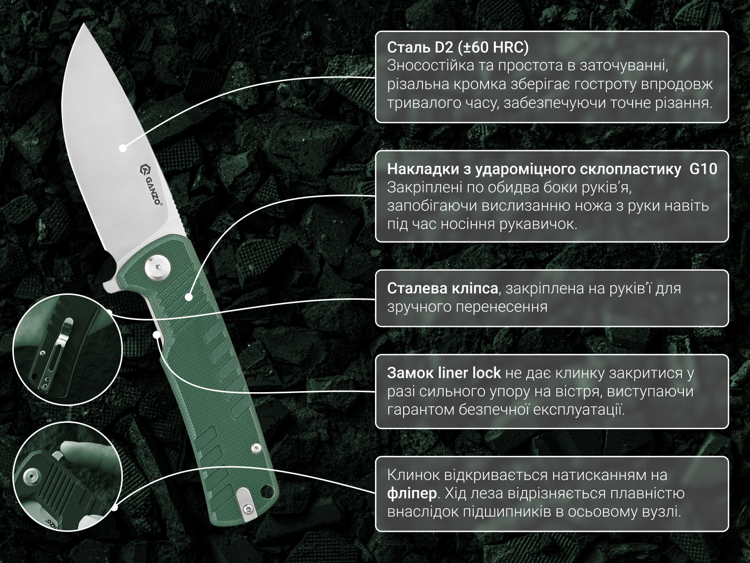 У ножі Ganzo G769 поєднуються довговічність, висока якість різання та лаконічний стиль, продуманий до дрібниць, щоб експлуатація приносила не лише користь, а й задоволення. Клинок виготовлений зі сталі D2 та відкривається натисканням на фліпер. Лезо замикається за допомогою замка liner lock. Плашки зі склопластику не дають інструменту вислизнути з долоні. Конструкція доповнена двопозиційною кліпсою.