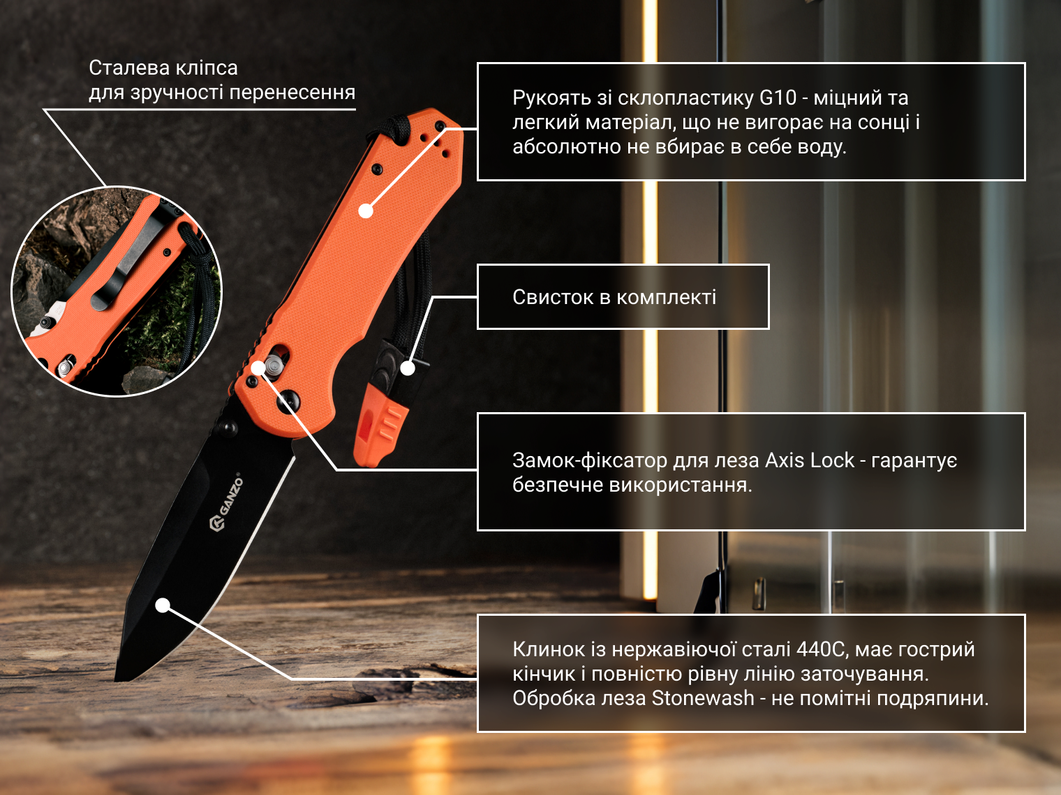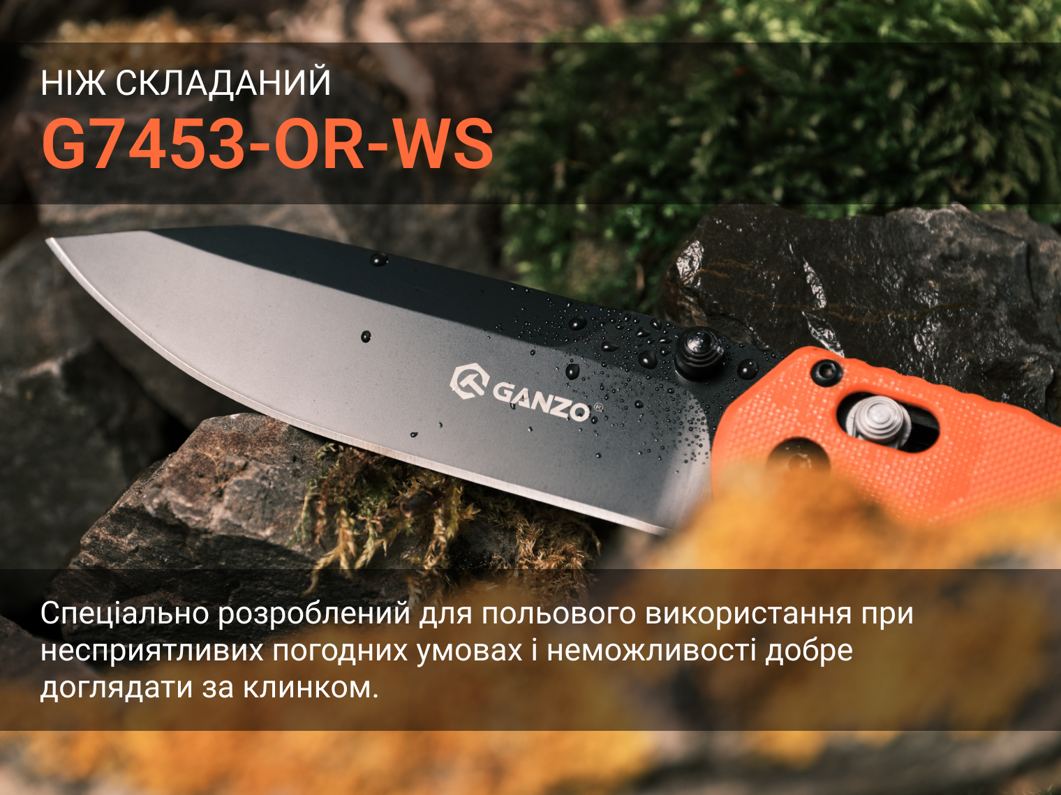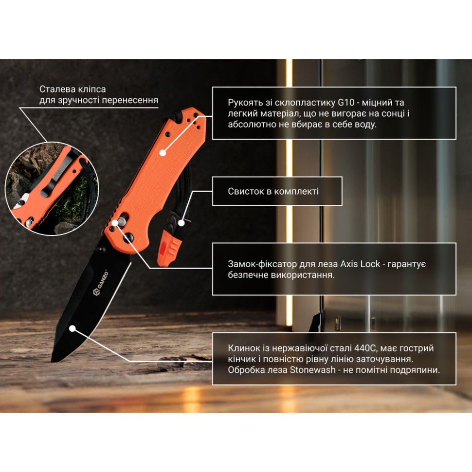 Модель Ganzo G7453 розроблена для туризму, поїздок на природу, може використовуватися в тактичних ситуаціях. Цей ніж легко складається і поміщається в кишеню, адже розмір клинка у Ganzo G7453 становить 9 см.а додатковим бонусом буде наявність свистка і страхувального темляка.