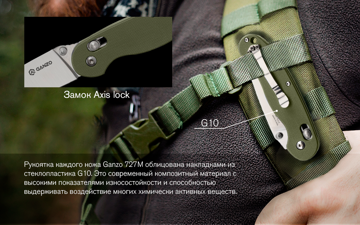 Также у D727 идеальная форма рукояти. Она удобно ложится в руку, снабжая нож надежным хватом. Сделана рукоять из прочного стеклопластика G10 - это композитный выносливый материал, термо- и влагоустойчивый. Легко поддается обработке, позволяя создавать нужные формы и фактуры. Мастера Ganzo создали рукоять с шершавой поверхностью - нож не выскользнет даже из мокрых рук.
