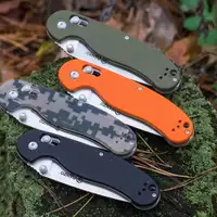 Материал накладок у ножей одинаковый — G10. Скругление краев при обработке у Онтарио чуть выше, но это заметно, только если сравнивать два ножа рядом. Расцветки: у Онтарио их гораздо больше, но и модель дольше на рынке. У Ганзо доступно 4 цвета: оранжевый, черный, зеленый, камуфляж.