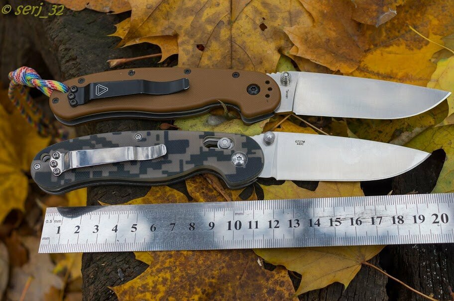 Проставочные шайбы на оси клинка латунные у обоих ножей. Клипса у Ontario может быть расположена в четырех позициях, а у Ganzo предусмотрены только две.