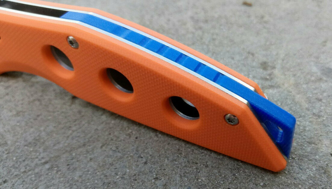 Оригинальным решением в данной модели являются не только симметричные сквозные отверстия в рукояти и её угловатые формы, а и наличие яркого бекспейсера, выполняющего по совместительству функцию приспособления для крепления темляка. В зависимости от вариаций накладок, бекспейсер будет иметь тот или иной цвет, отличающийся от рукояти. Таким образом, дизайнерам модели Firebird FB7621 удалось создать действительно яркий и запоминающийся нож.