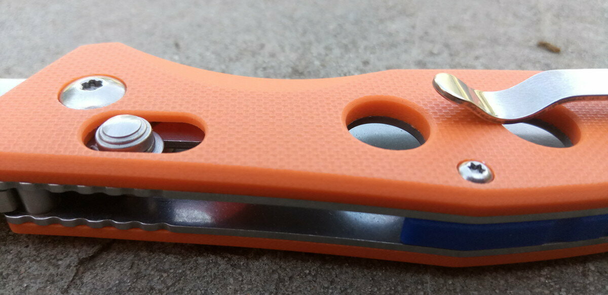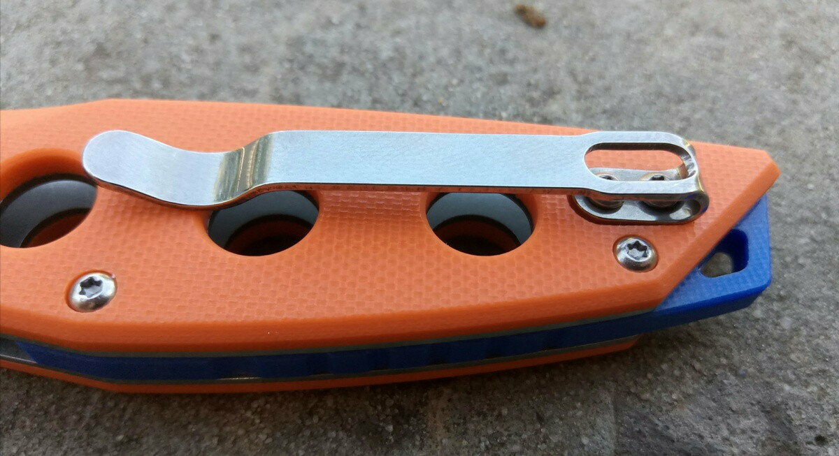 К одной из сторон рукояти крепится металлическая клипса. При закреплении ножа на кармане, небольшая его часть всё же будет «выглядывать», однако, он гарантированно не выпадет при движении.