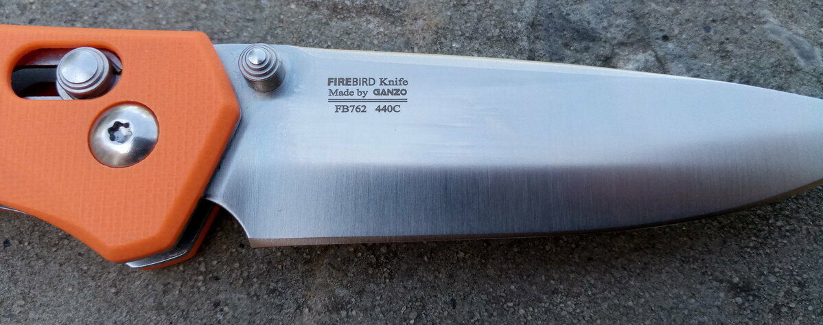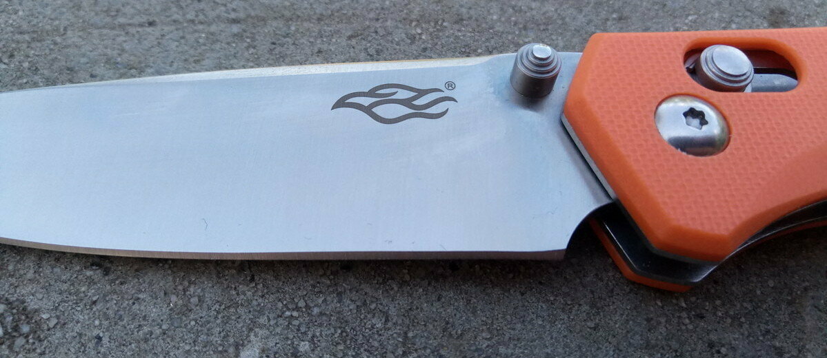 Нож имеет довольно яркий дизайн, особенно в исполнении с оранжевыми накладками. Клинок имеет «классическую» форму и на одну из его сторон лазерной гравировкой нанесен логотип Firebird. На другой стороне лезвия отмечено название модели, марка используемой стали и упоминание о компании Ganzo (название до ребрендинга).
