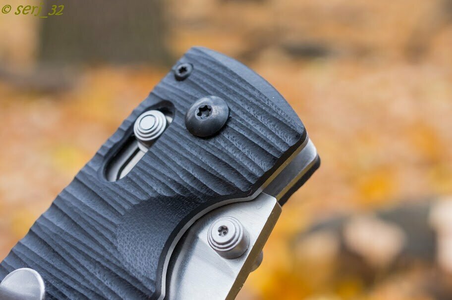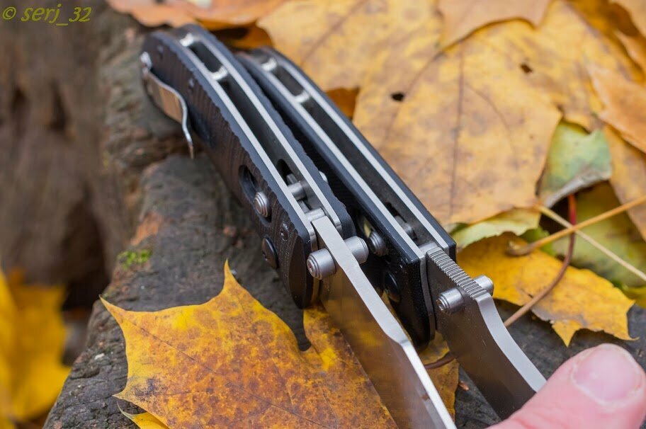 Насечки для упора большого пальца на обухе нет. Замок работает не очень хорошо. Точнее — его подпружиненный блокиратор. На других моделях эта деталь работает мягче. Шайбы на оси клинка второпластовые. Заточка неплохая, на уровне всех ножей этой марки — бреют волосы на руке, но с небольшим усилием. Лезвие кажется большим из-за своей изогнутой формы и небольшого фальшлезвия со стороны обуха.