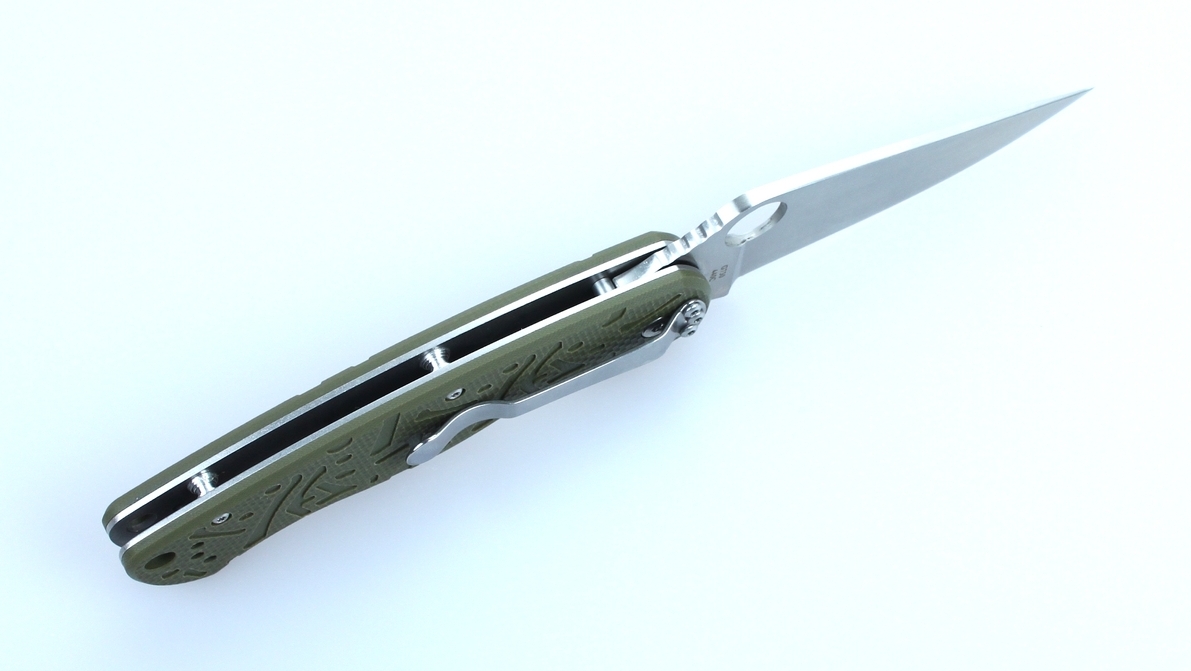 Ganzo G730 – складной, как и большинство моделей данного бренда. Это отличный вариант конструкции для туристических, рыбацкий, охотничьих ножей. Ведь их просто носить с собою не только в рюкзаке или на поясном ремне, но и попросту в кармане, используя каждый раз, когда в этом возникает необходимость. Глядя на него, в первую очередь, в глаза бросается, конечно же, дизайн. У ножа весьма оригинальная форма клинка, который от острого кончика существенно расширяется в сторону рукоятки. Причем, лезвие становится настолько широким, что его форма даже напоминает треугольник. А в верхней части клинка есть круглое отверстие, такое же как у ножей Spyderco. Для Spyderco оно долгое время оставалось визитной карточкой бренда. Теперь особенность переняли и в Ganzo.