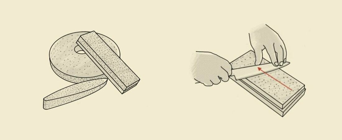 Используя точильный камень нужно следить за тем, чтобы лезвие ножа постоянно находилось под одним и тем же углом по отношению к его плоскости. Иначе, режущая кромка будет иметь с одной стороны больший наклон, что в итоге негативно скажется на качестве и удобстве реза.