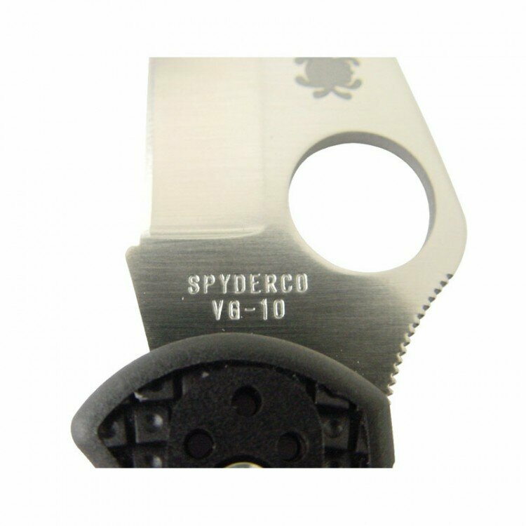VG-10 — сталь японского производства. Она широко применяется брендом Spyderco. Этот сплав отлично держит заточку, хотя режущую кромку нужно оберегать от импульсной нагрузки, иначе возможны сколы. В ней 0,95-1,05% углерода, 14,5-15,5% хрома, 1,4% кобальта, 1,05% молибдена, 0,5% марганца, 0,6% кремния. Твердость сплава очень высока — 59-61HRC.