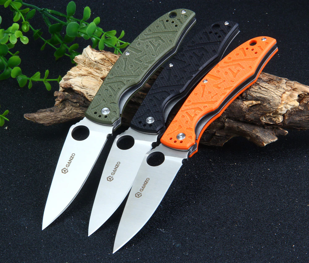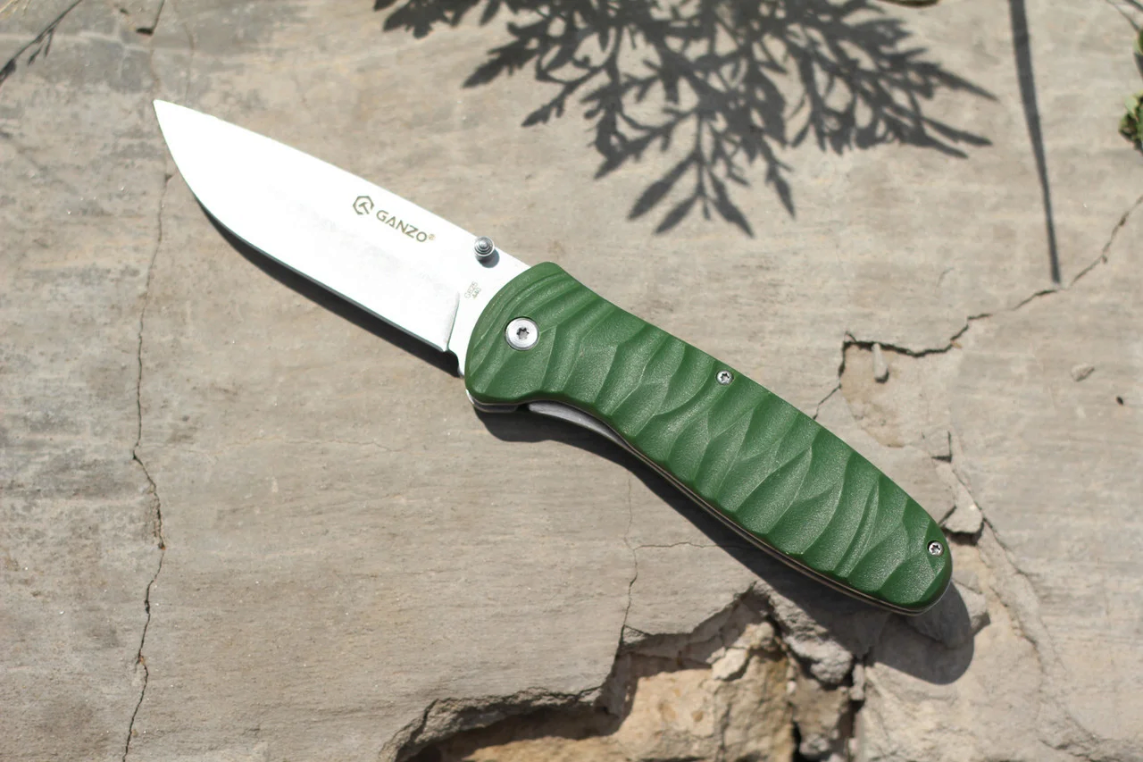 Рукоять – эргономичность и комфорт. Ручка должна быть удобной. Наиболее подходящие для природы и диких условий модели Ganzo имеют выемку для упора указательного пальца и перфорированную ручку из специального ABS-термопластика. Такой материал позволяет придать рукояти нужную форму, не скользит в руке, не замерзает на холоде, не впитывает воду, износостойкий и удароустойчивый. Также для рукояти хорош стеклопластик – fiberglass, который по многим параметрам прочнее пластика. Сюда же относится легкий, но очень прочный G10 (стеклоткань+эпоксидные смолы). Рукоять должна комфортно сидеть в ладони и обеспечивать надежный хват.