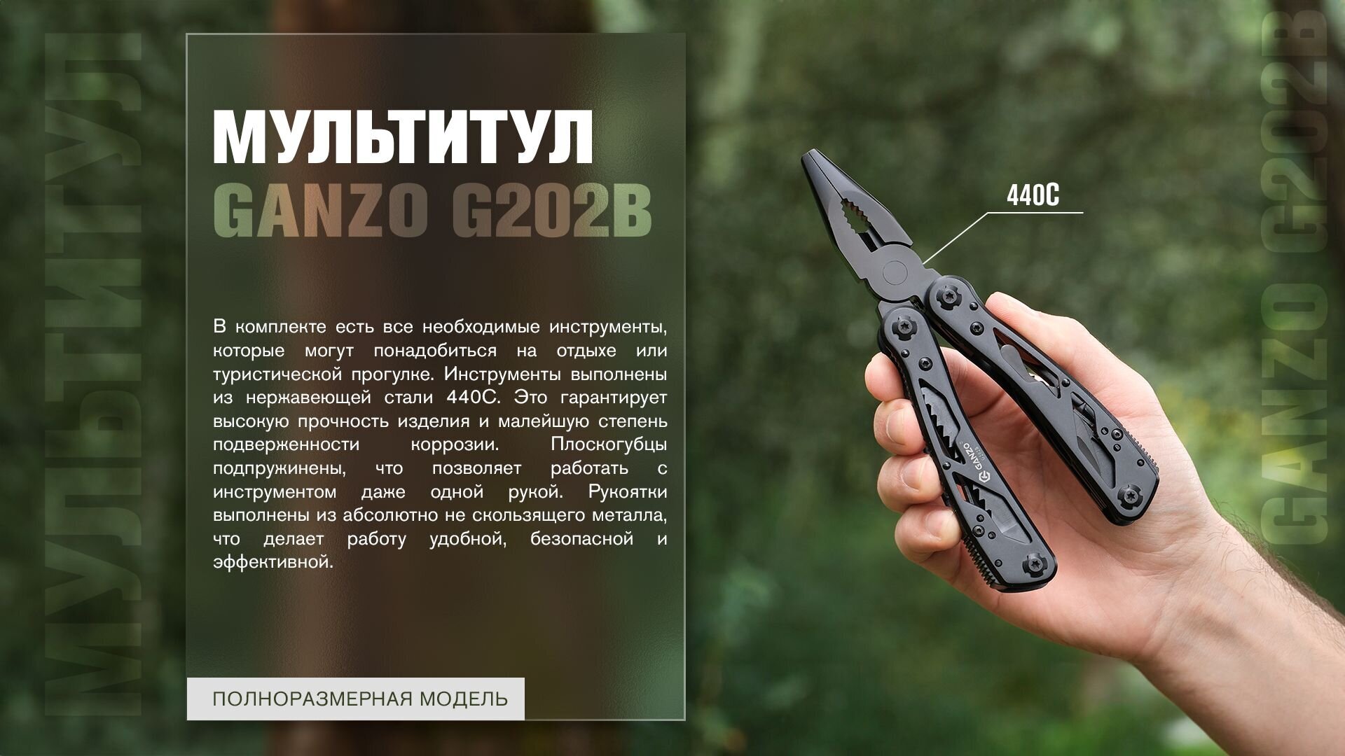 Ganzo G202B — универсальный мультитул для туризма, активного отдыха и ежедневного использования. Благодаря 24 функциям он заменяет целый набор инструментов, оставаясь компактным элементом вашего снаряжения: