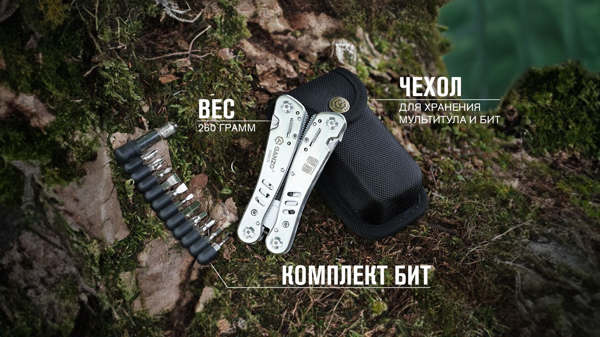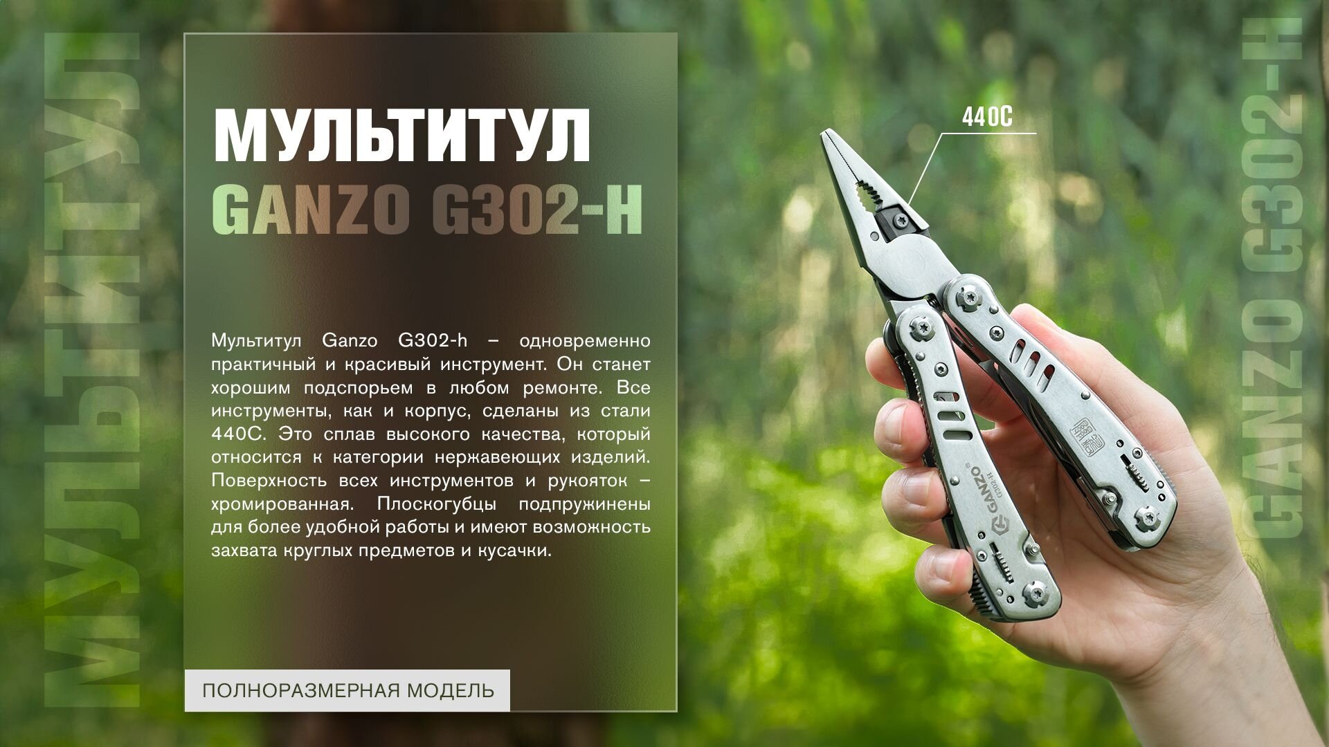 Ganzo G302-Н — это мультитул на основе уже известной модели от бренда Ganzo. Однако изменения коснулись не только обработки металла, но и внешнего вида некоторых инструментов. В итоге, покупатели получили еще один прекрасный образец практичного инструмента, пользу которого каждый владелец сможет оценить на практике. Все инструменты, как и корпус мультитула Ganzo G302-Н, сделаны из стали 440С. Это сплав высокого качества, который относится к категории нержавеек. Он вполне может использоваться в условиях частого контакта с водой, какие характерны для туристических походов, поездок на рыбалку и охоту. Минимальный уход за инструментом обеспечит ему долговечность и сохранность внешних качеств. Главный по принципу расположения инструмент мультитула — это плоскогубцы. Они также наделены функцией кусачек и возможностью крепкого захвата гаек, втулок и других круглых в сечении предметов. Остальные инструменты распределены между двумя рукоятками мультитула и размещены внутри них. Это два ножа (обычный и серрейторный), пила, открывалки для консервов и бутылок, ножницы, шило, небольшая отвертка с прямым шлицем, магнитный держатель для сменных бит, инструмент для снятия с проводов изоляции. Вместе с мультитулом продается и набор необходимых для работы с различными винтами и шурупами отверток. Они размещены в одном общем органайзере. Этот органайзер вместе с мультитулом может храниться в одном нейлоновом чехле.