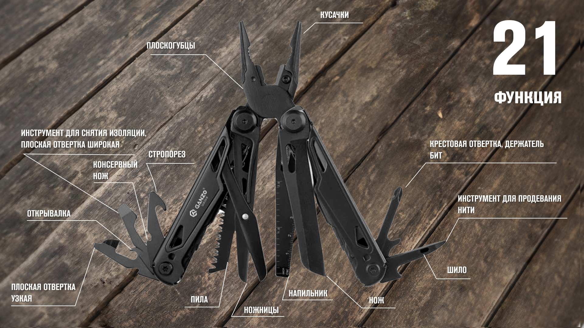 В складных рукоятях спрятано множество других элементов разных габаритов, которые легко поддеваются пальцем и раскрываются до фиксации в рабочем положении. Среди них есть клинок с прямой заточкой, серрейторная пила, ножницы, напильник и линейка, открывалки для бутылок и жестяных банок, одна крестообразная и две плоские отвертки, инструмент для зачистки проводов, стропорез, шило. Каждый элемент тщательно продуман и подогнан таким образом, чтобы обеспечить оптимальную функциональность и надежную фиксацию в открытом и закрытом положениях.