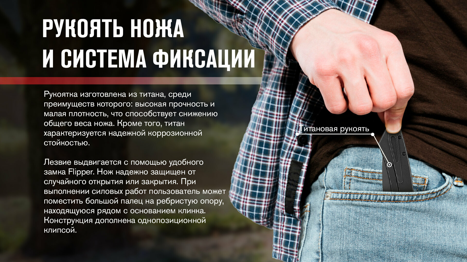 Материал рукояти — титан. Среди его преимуществ: высокая удельная прочность и малая плотность, способствующая снижению общего веса ножа до 92.3 г против 120 г у базовых моделей.